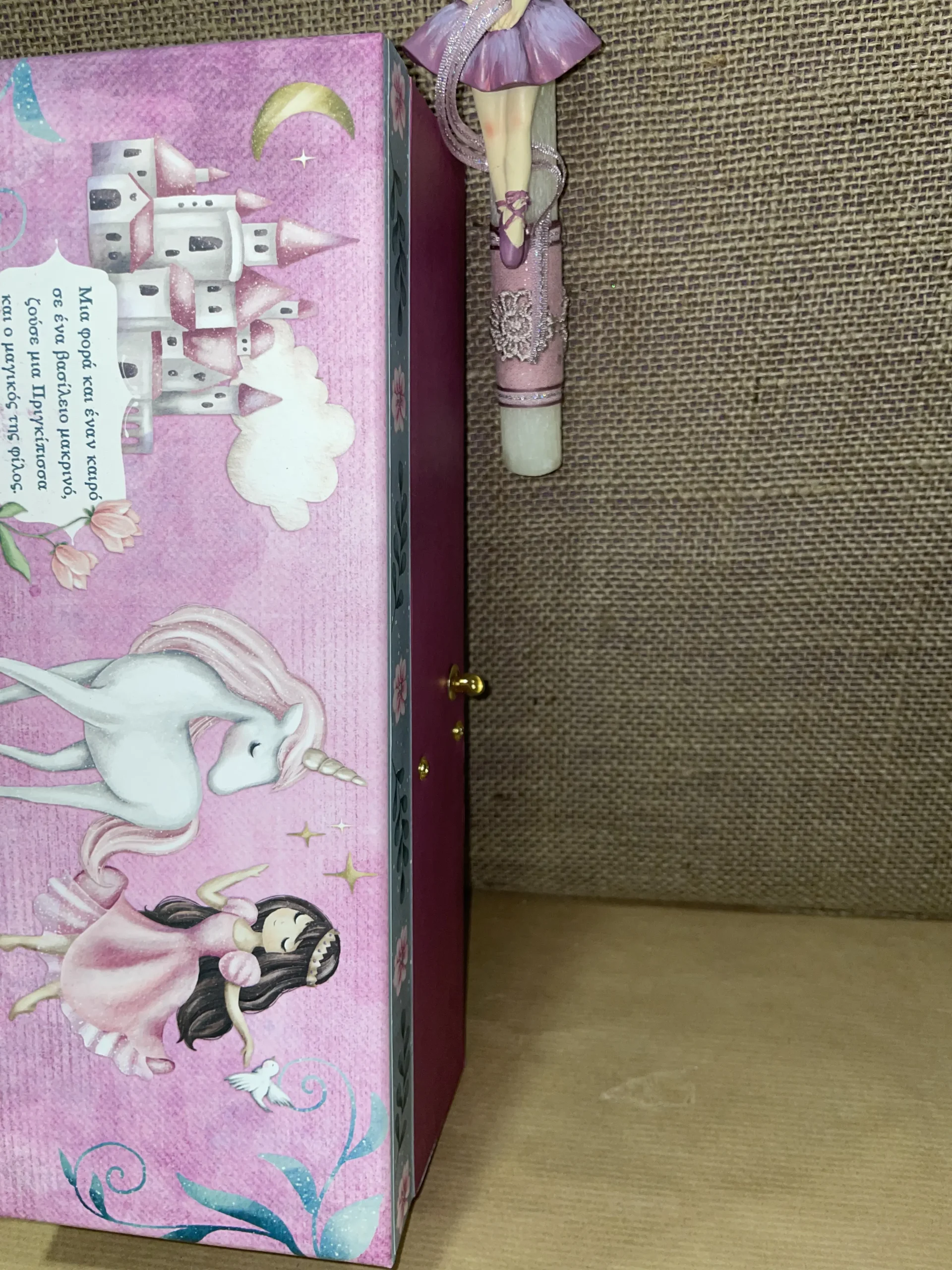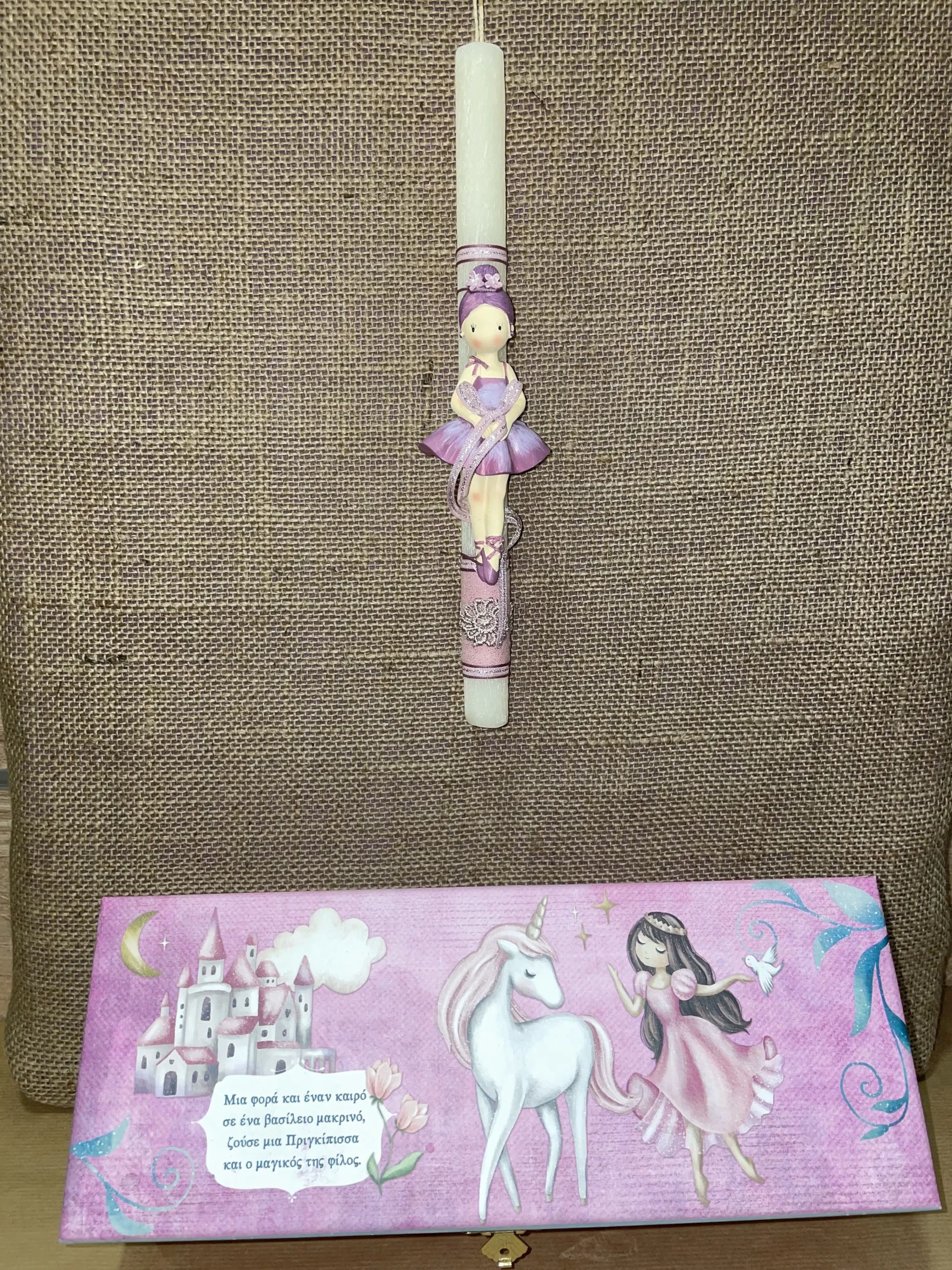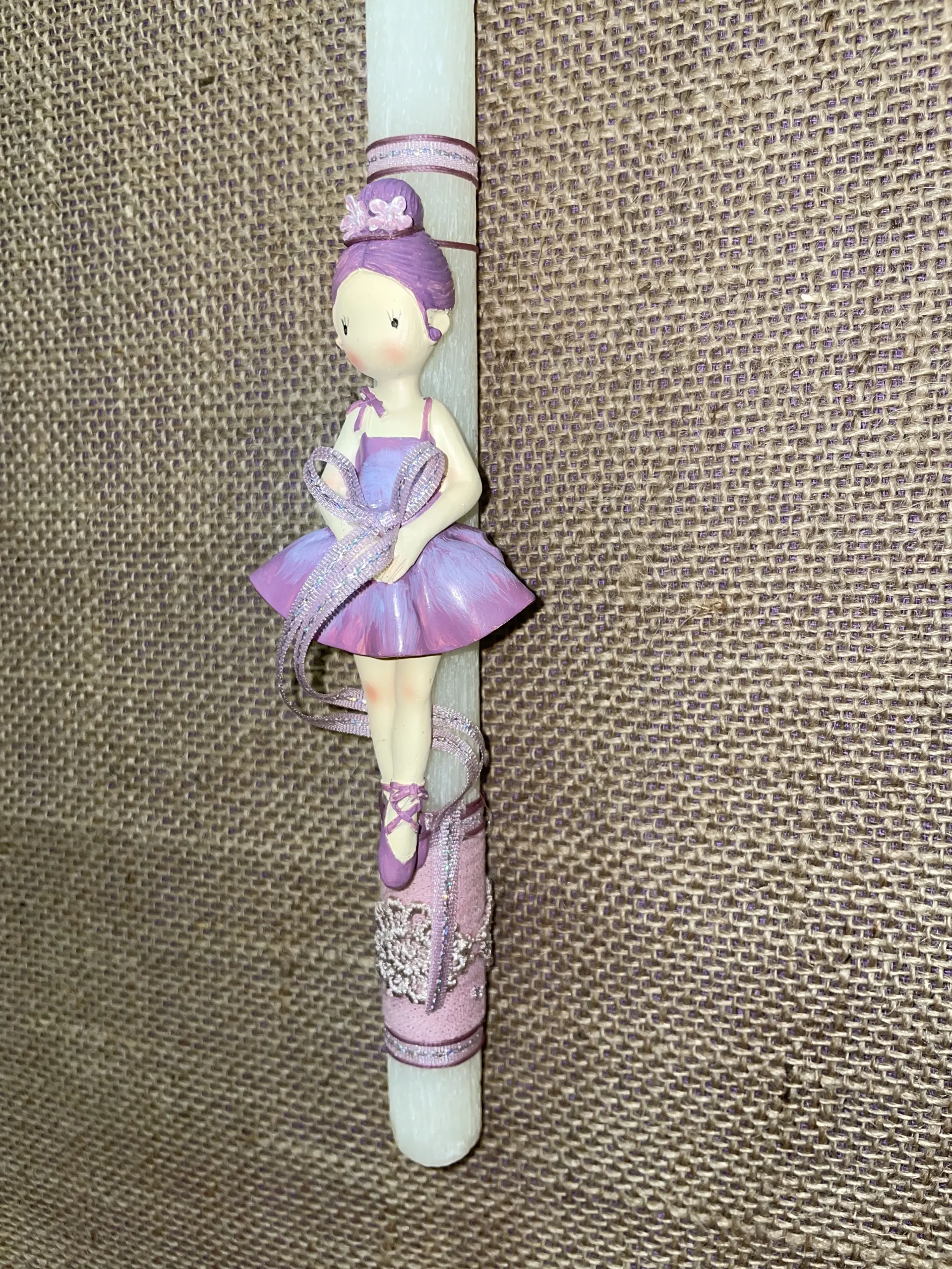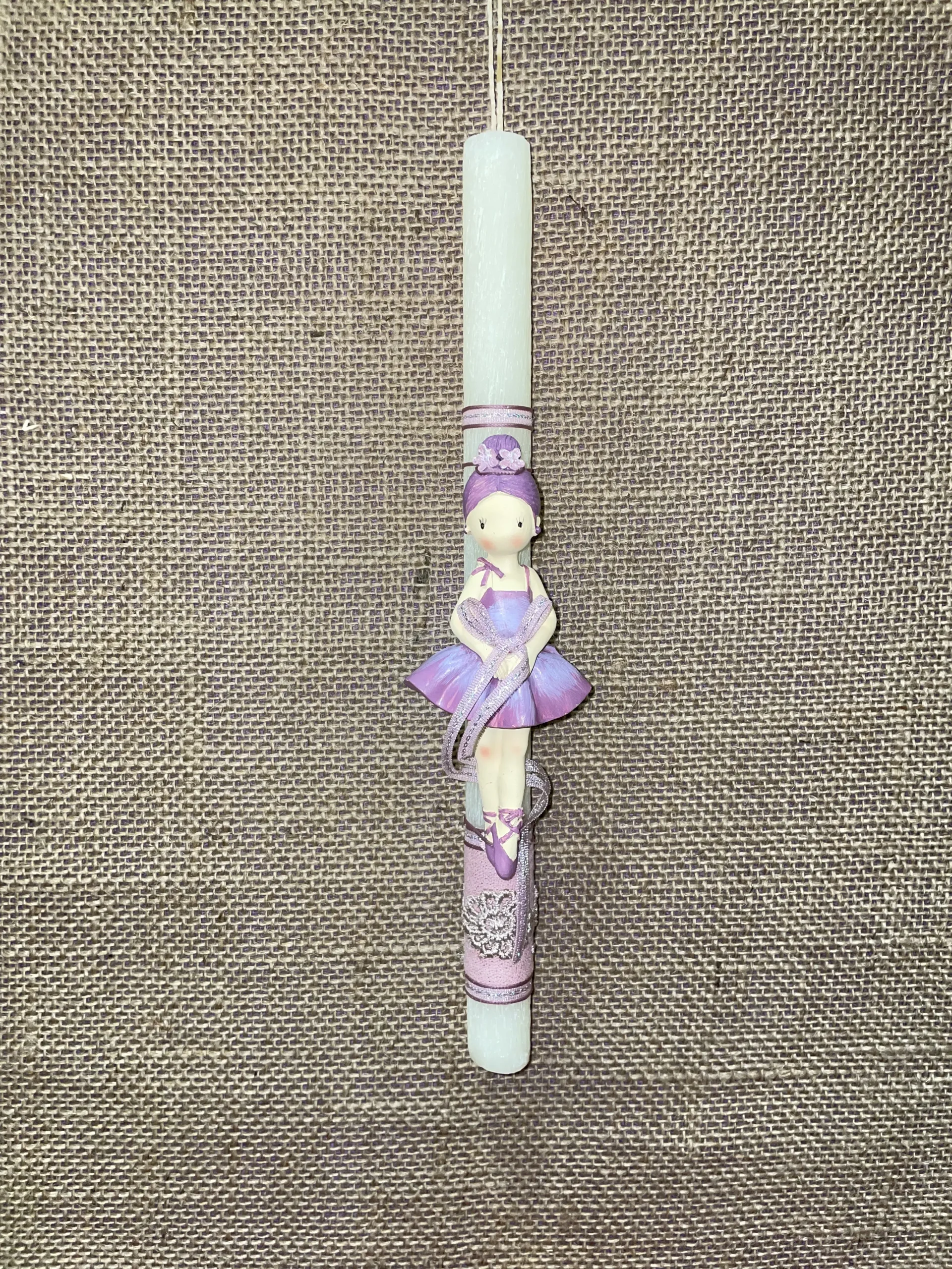 Ετικέτα: Λευκή στρογγυλή λαμπάδα με μωβ μπαλαρίνα μέσα σε κουρδιστό μουσικό κουτί