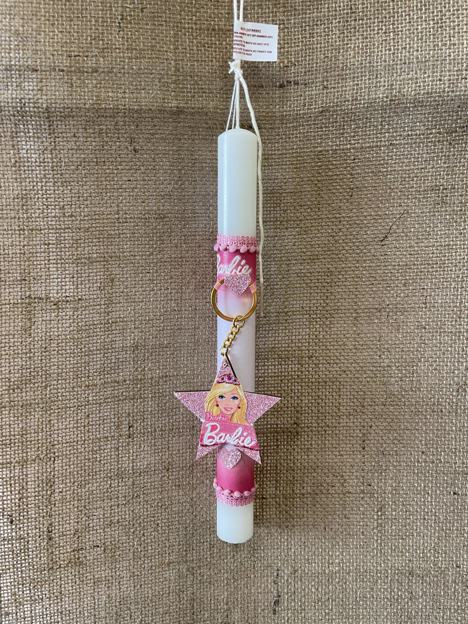 Λευκή στρογγυλή λαμπάδα με ντεκουπάζ και μπρελόκ Barbie