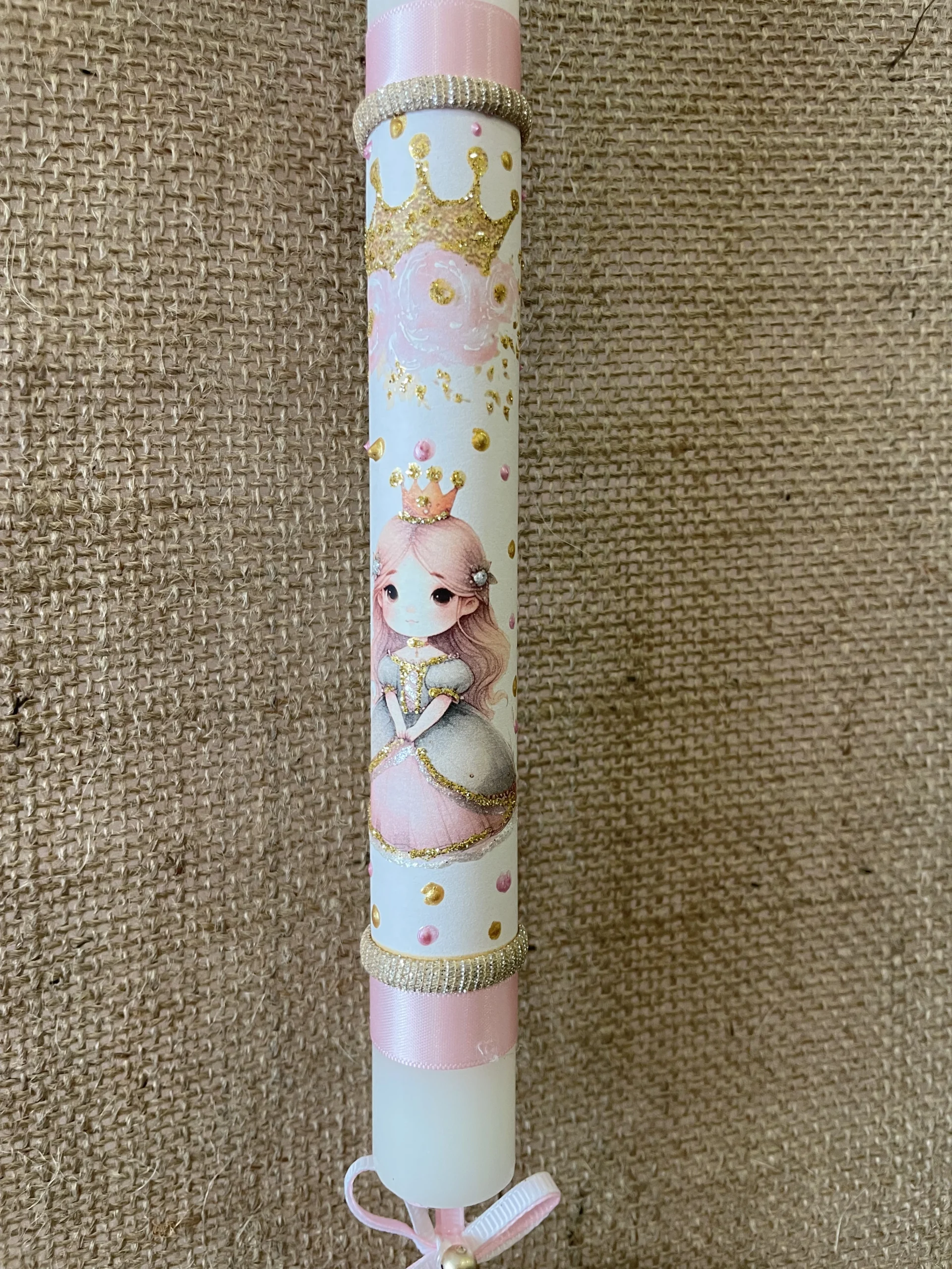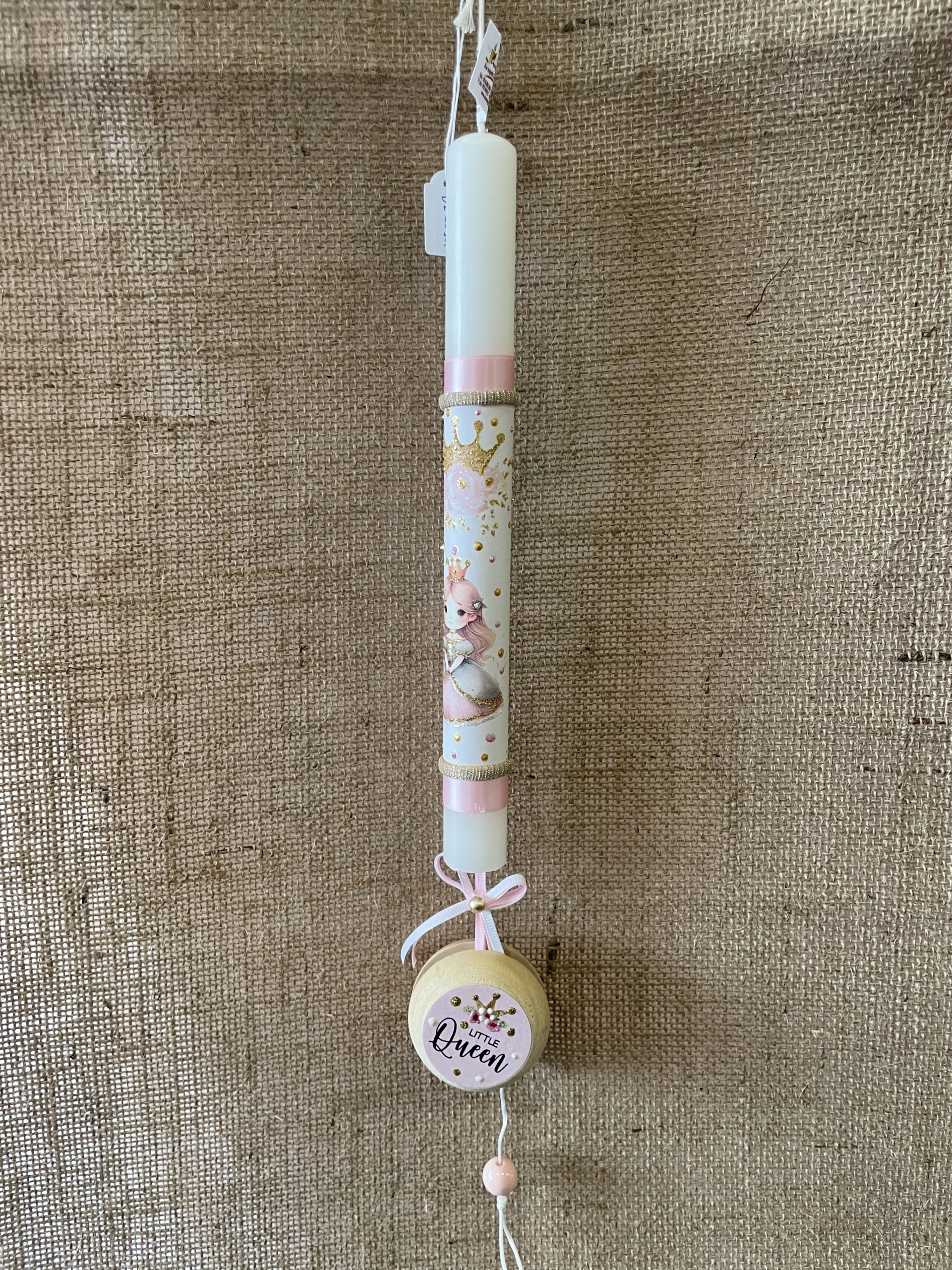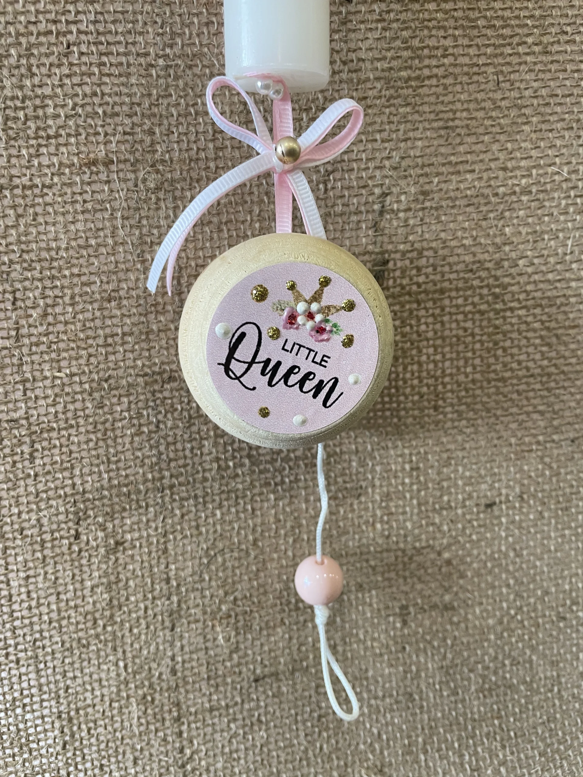 Λευκή στρογγυλή λαμπάδα με ντεκουπάζ Βασίλισσα και κρεμαστό ξύλινο Γιο Γιο