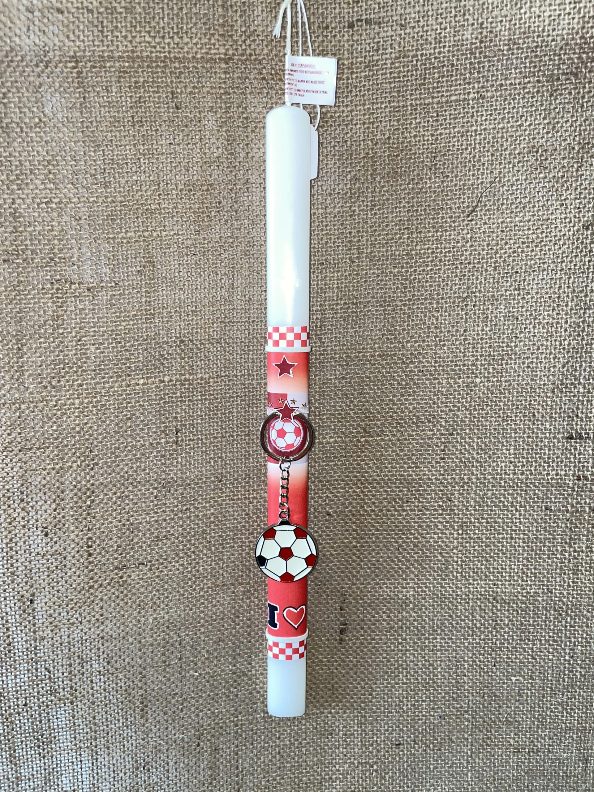 Λευκή στρογγυλή λαμπάδα με ντεκουπάζ ΟΣΦΠ και μπρελόκ μεταλλικό με πλακέ μπάλα ποδοσφαίρου