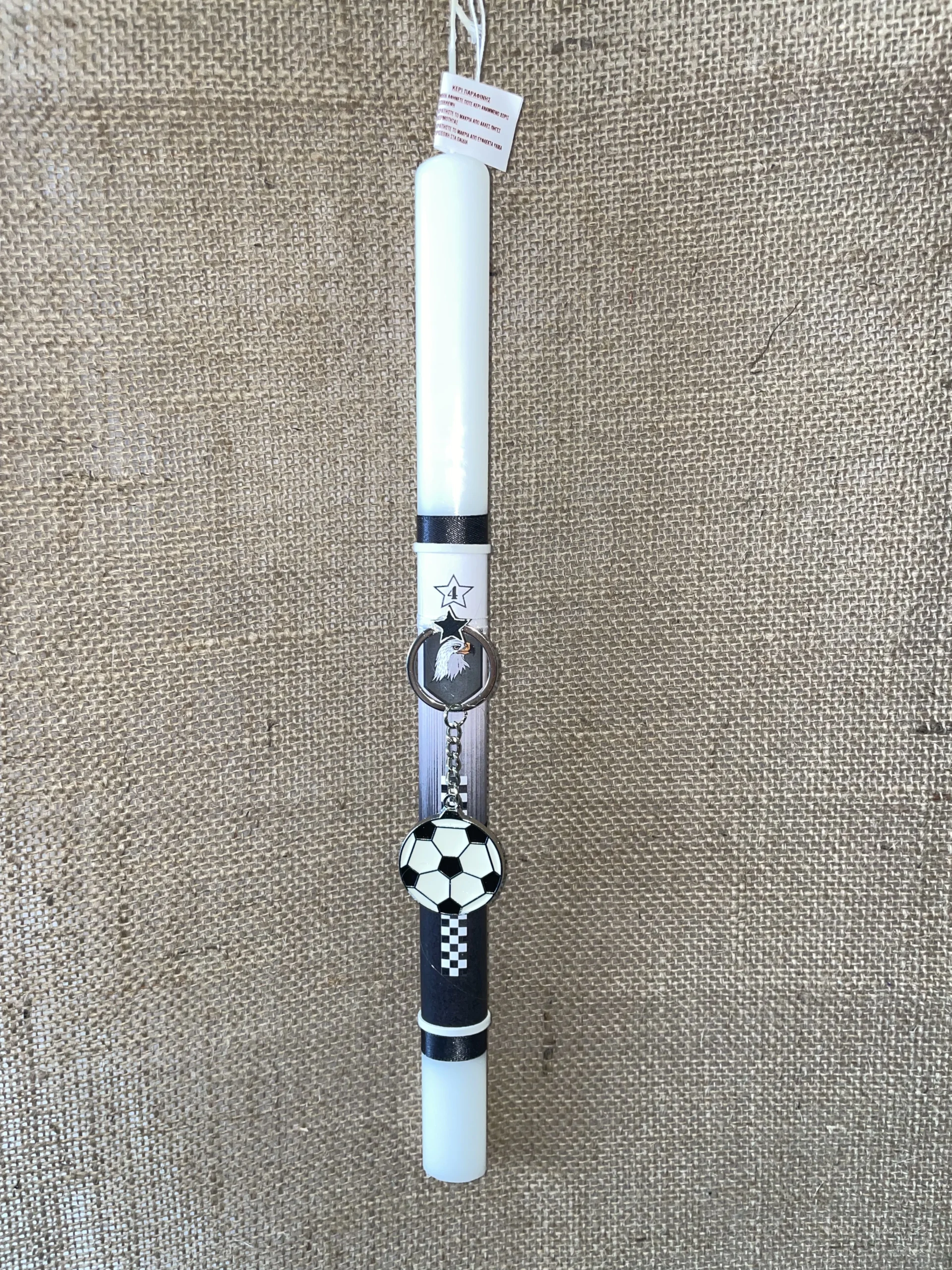 Λευκή στρογγυλή λαμπάδα με ντεκουπάζ ΠΑΟΚ και μπρελόκ με πλακέ μεταλλική μπάλα ποδοσφαίρου
