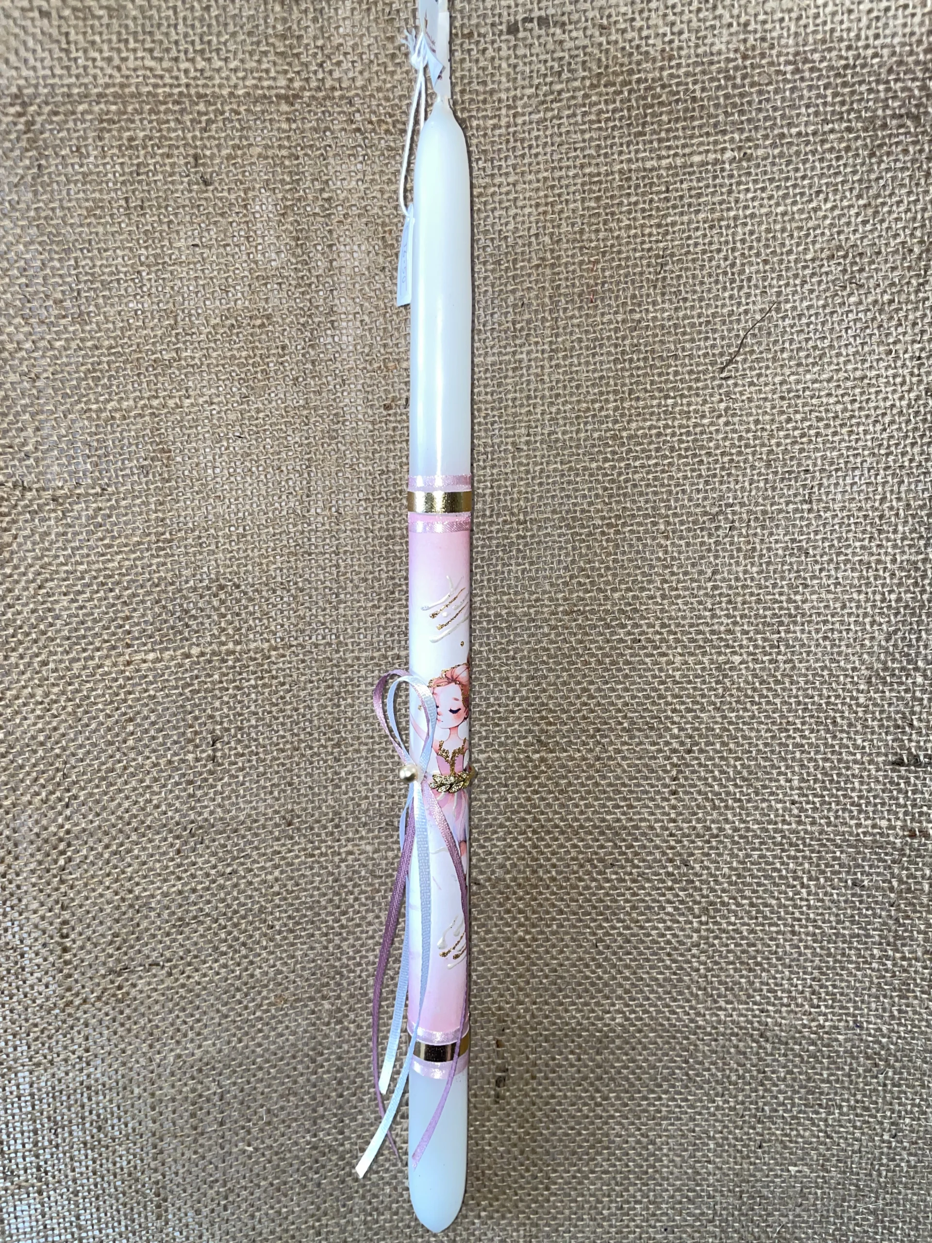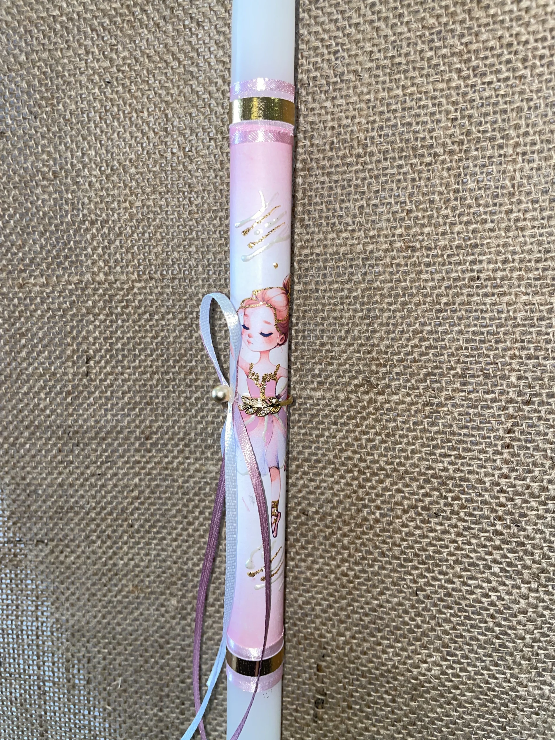 Λευκή στρογγυλή λαμπάδα με ντεκουπάζ μπαλαρίνα και χρυσό δαχτυλίδι
