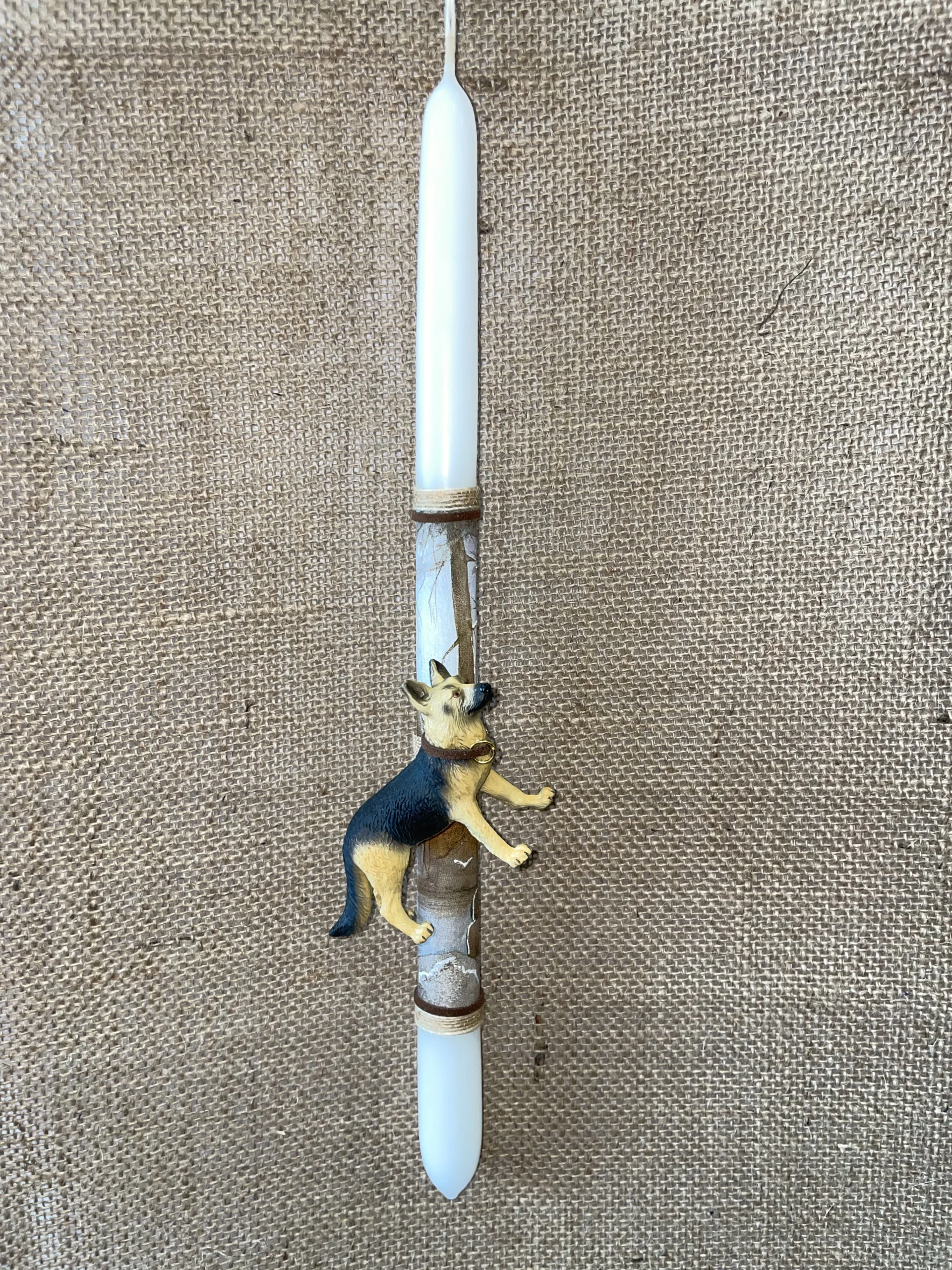 Λευκή στρογγυλή λαμπάδα με παιχνίδι σκύλο ( Γερμανικό Ποιμενικό)