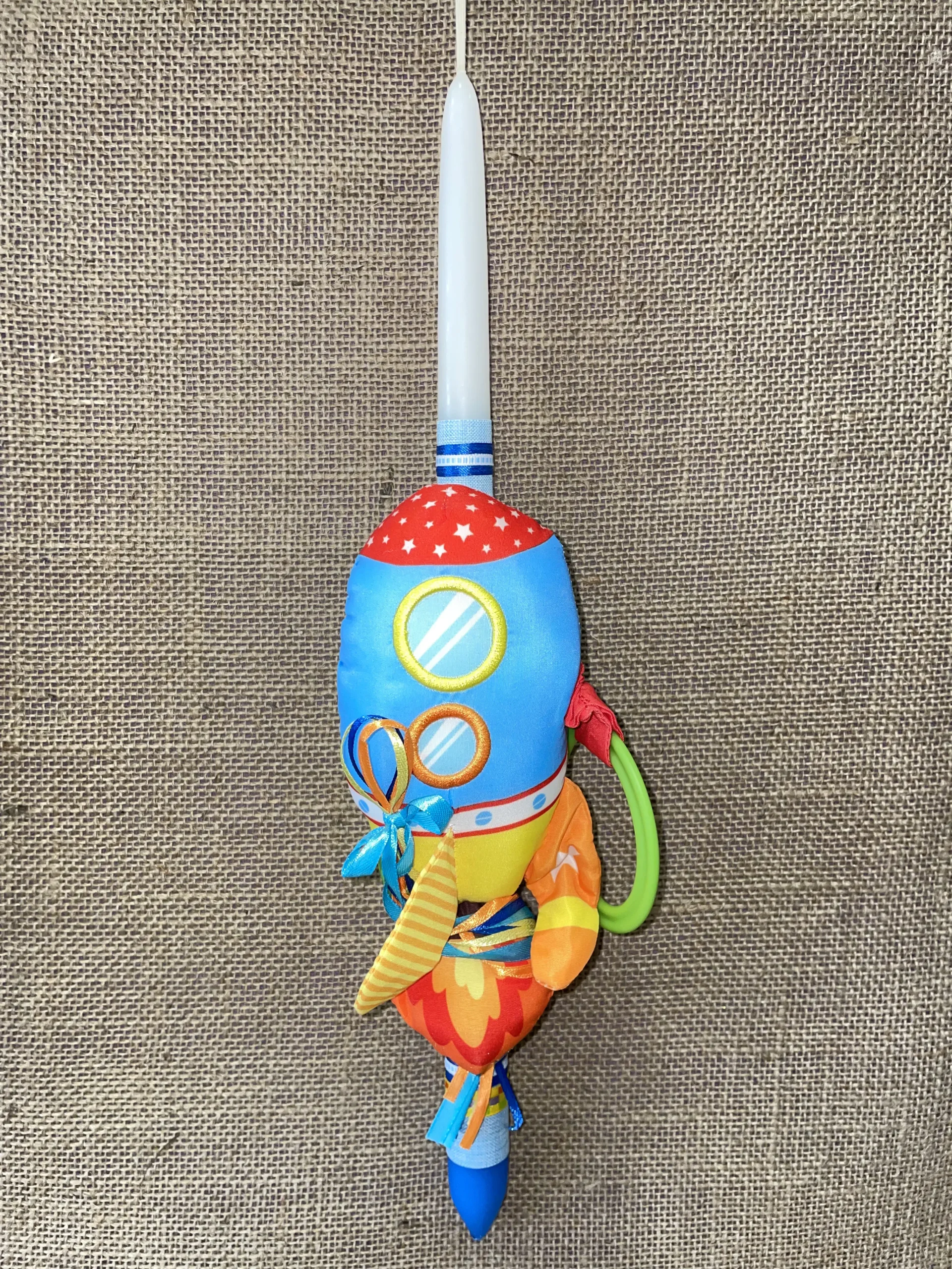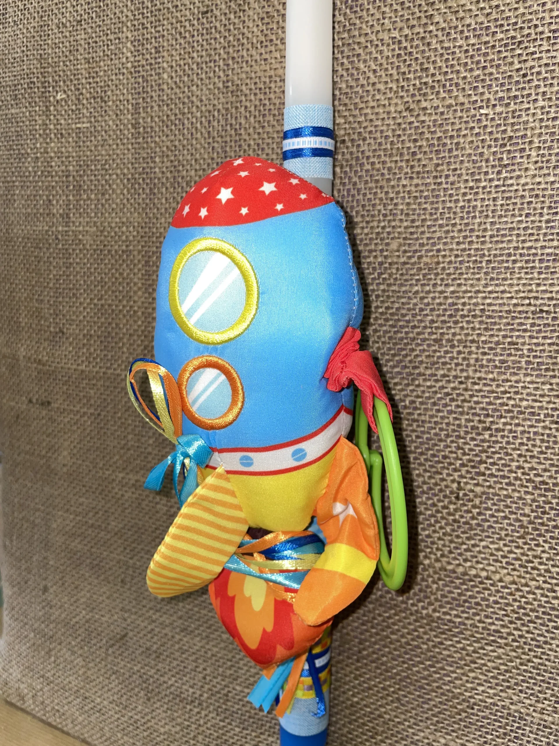 Ετικέτα: Λευκή στρογγυλή λαμπάδα με πολύχρωμο λούτρινο παιχνίδι με μουσική
