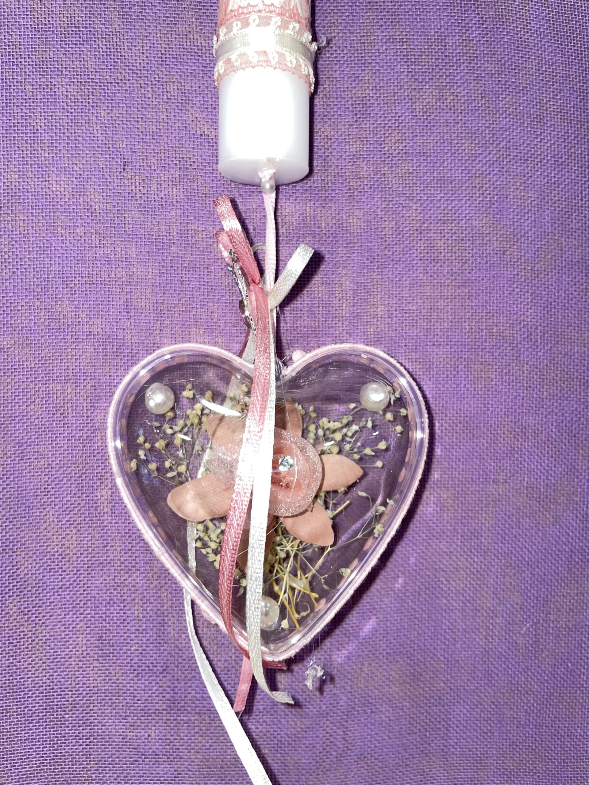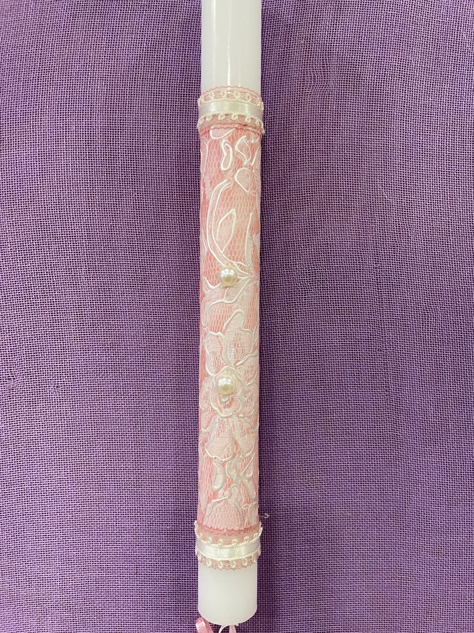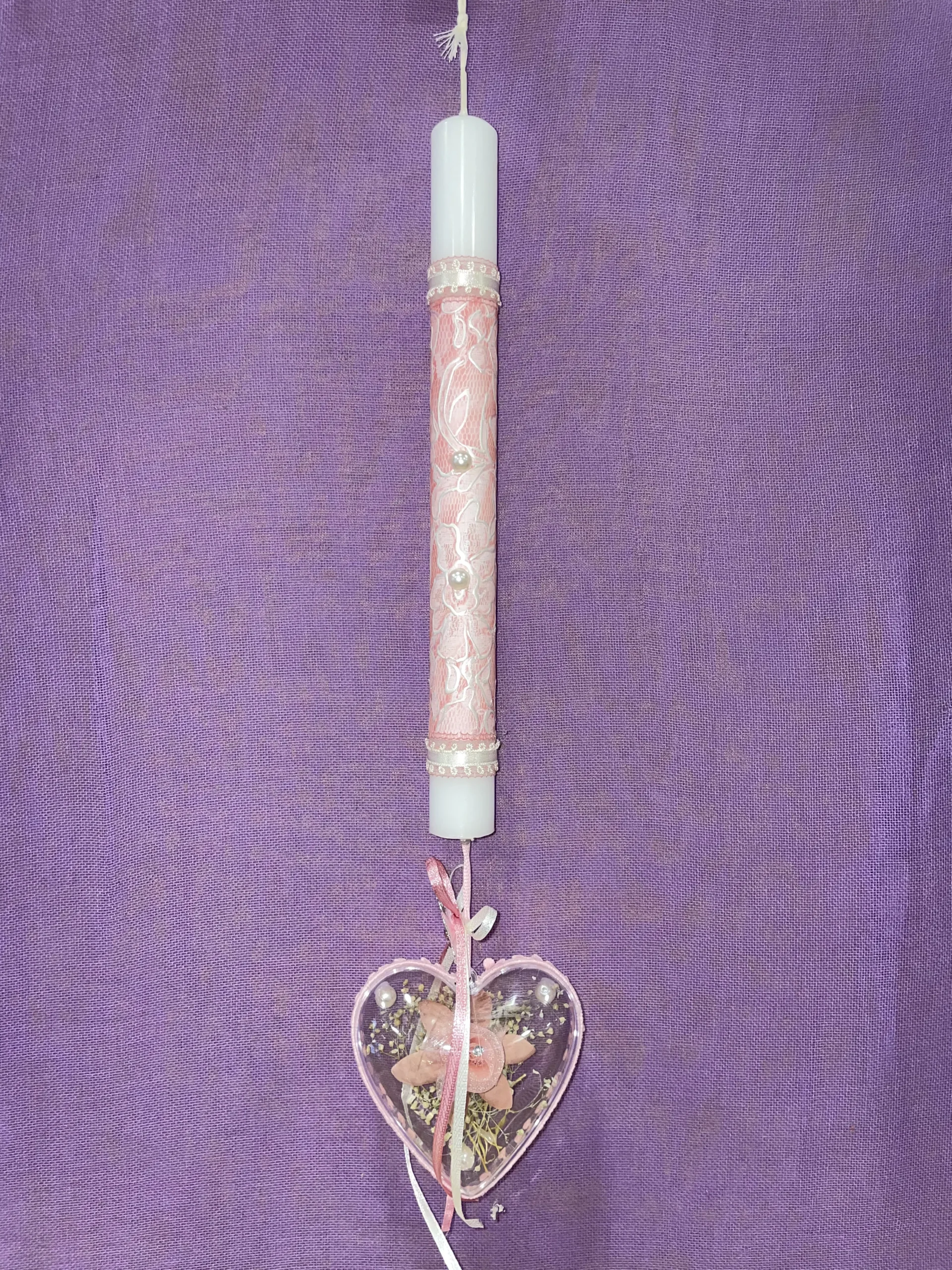 Λευκή στρογγυλή λαμπάδα με ροζ δαντέλα και κρεμαστή καρδιά