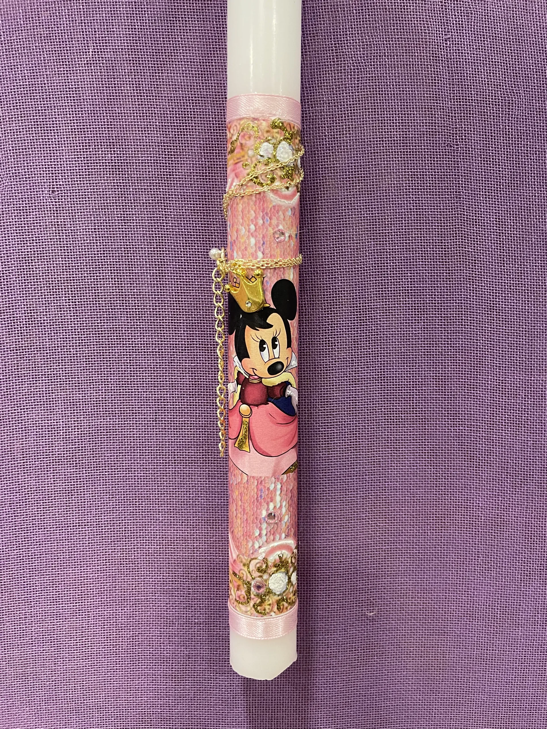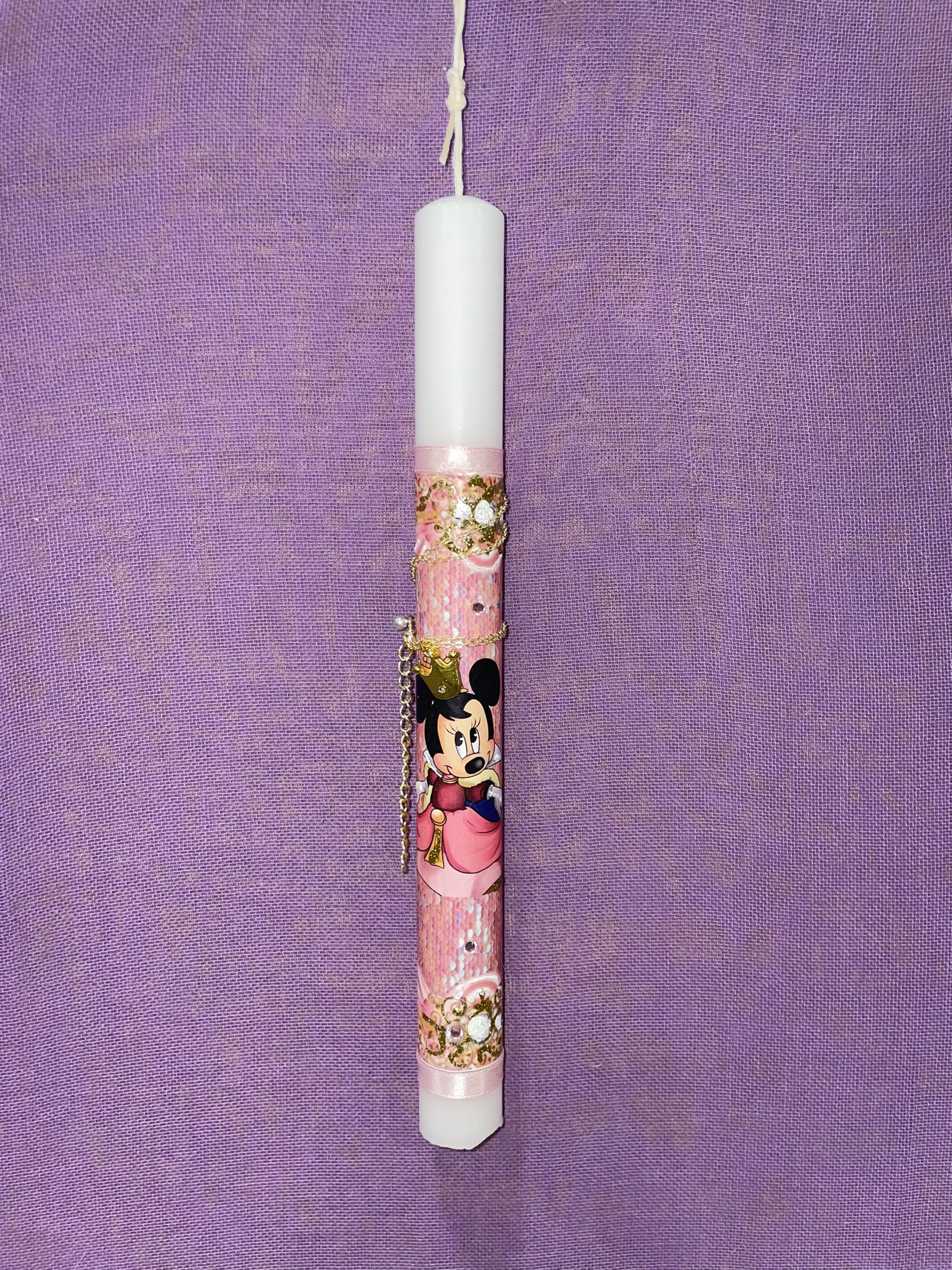 Ετικέτα: Λευκή στρογγυλή λαμπάδα με την Minnie και χρυσό μενταγιόν στέμμα