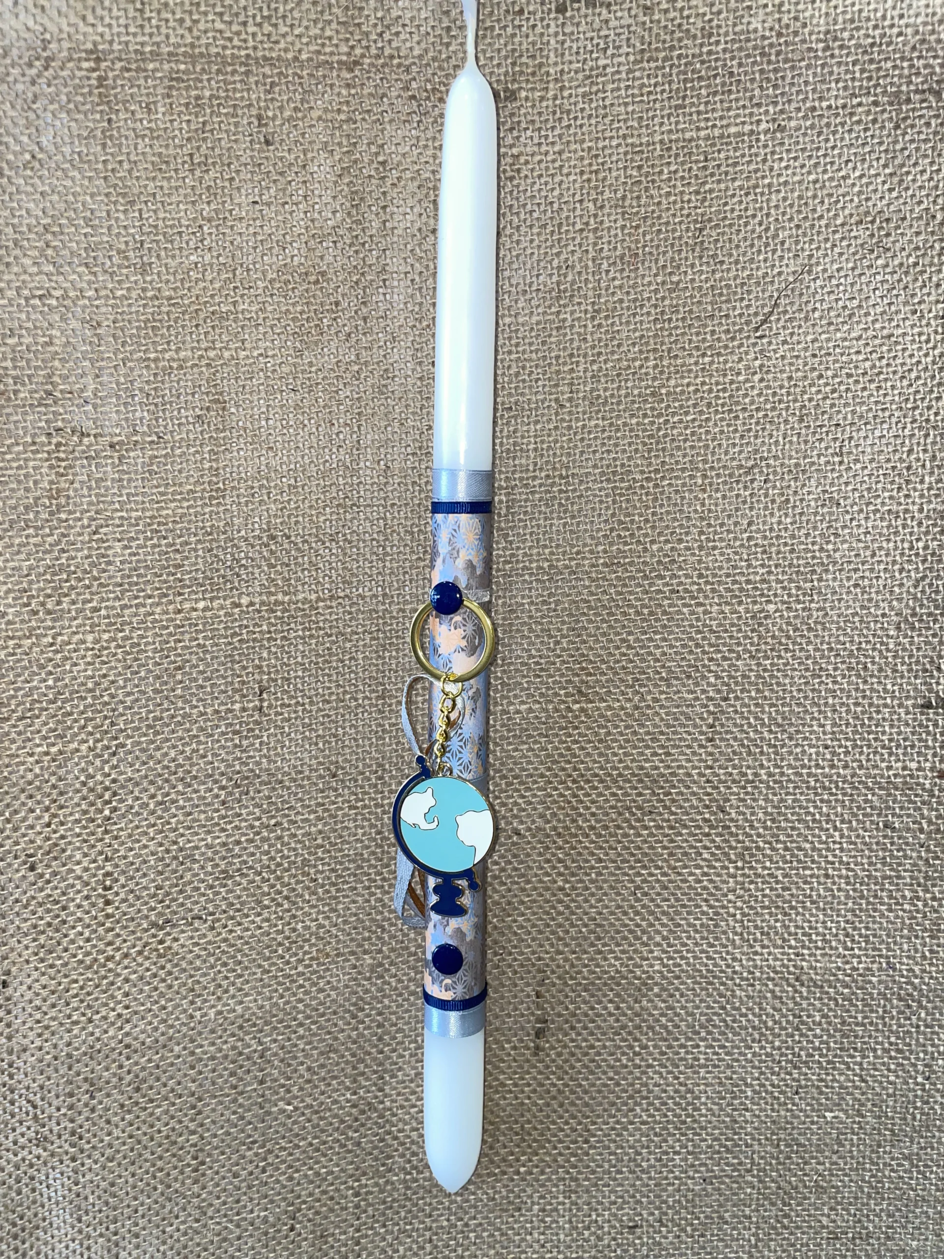 Ετικέτα: Λευκή στρογγυλή λαμπάδα με φόντο χάρτη και μπρελόκ υδρόγειο
