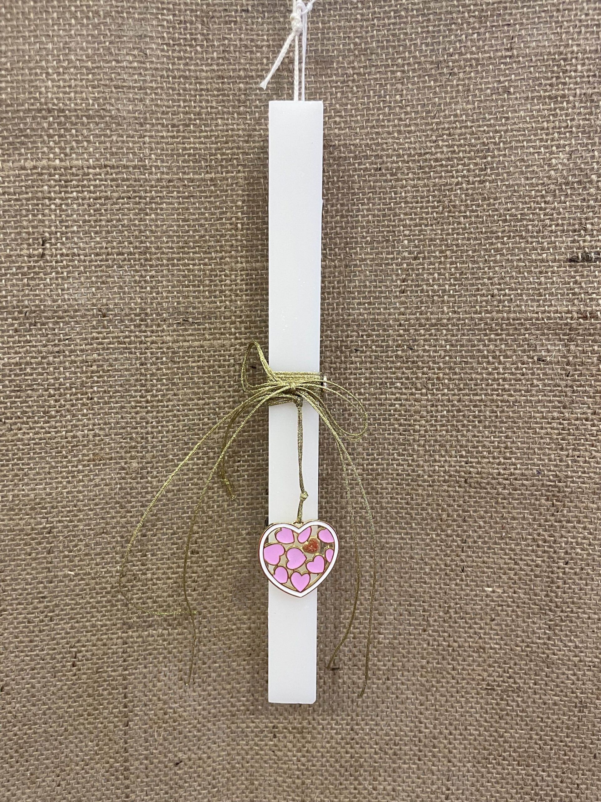 Λευκή τετράγωνη αρωματική λαμπάδα με κολιέ μεταλλική καρδιά χρυσό με ροζ