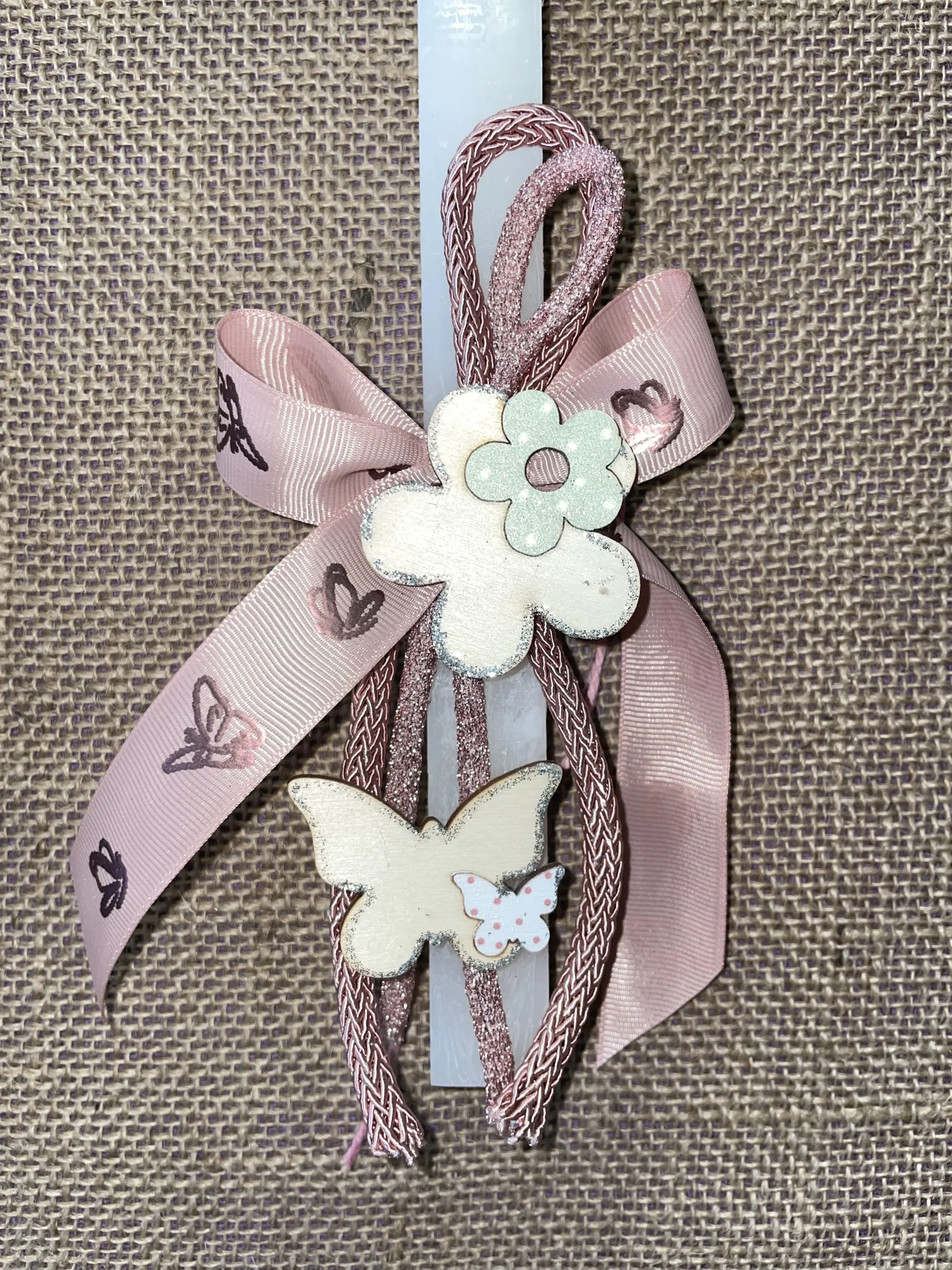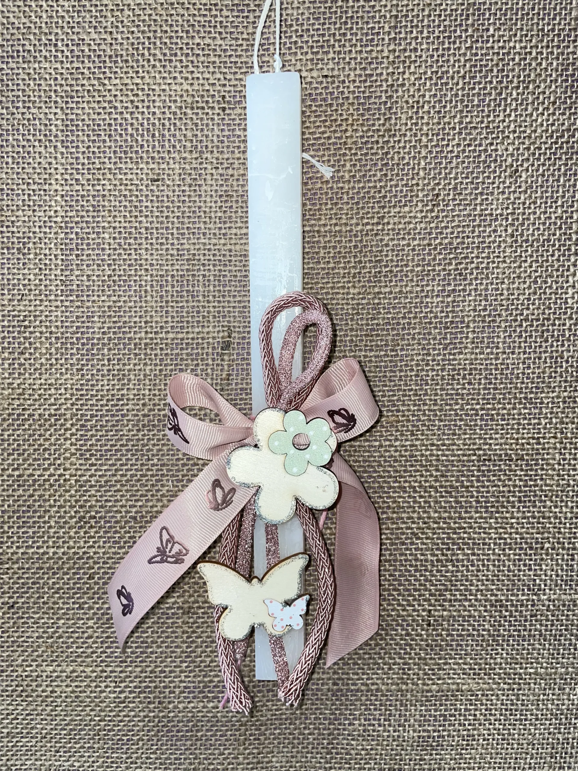 Λευκή τετράγωνη αρωματική λαμπάδα με ξύλινο λουλούδι και πεταλούδα