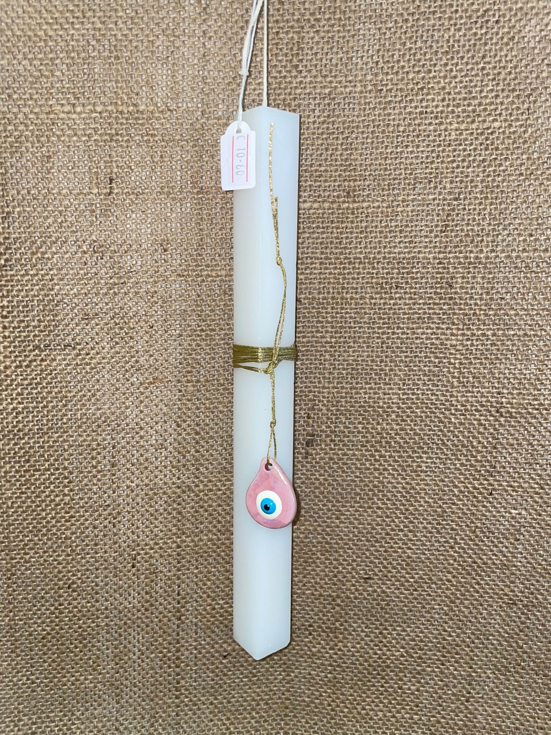 Λευκή τετράγωνη αρωματική λαμπάδα με διακοσμητικό κεραμικό ροζ ματάκι