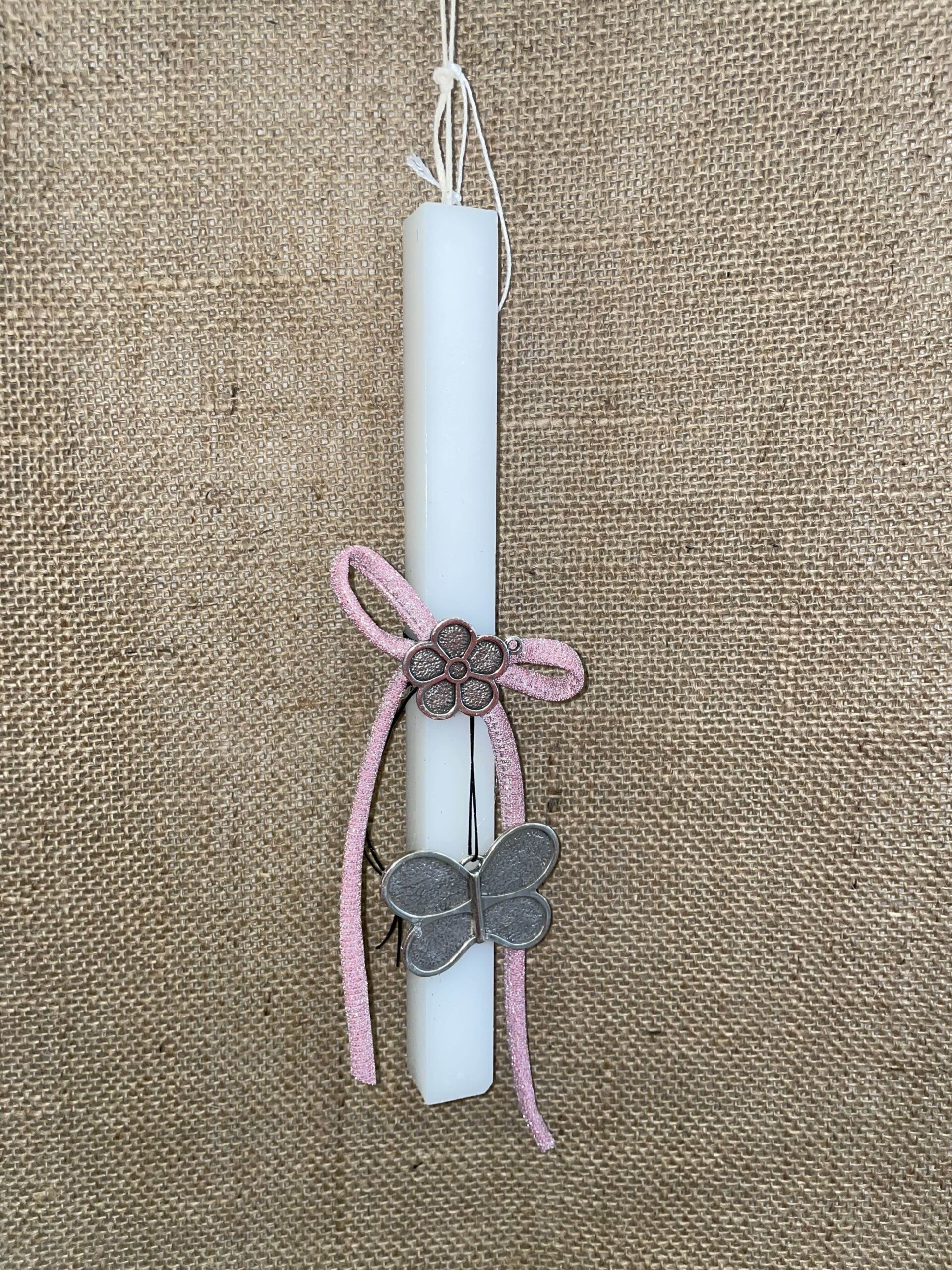 Λευκή τετράγωνη λαμπάδα με πεταλούδα και λουλούδι μεταλλικά κρεμαστά