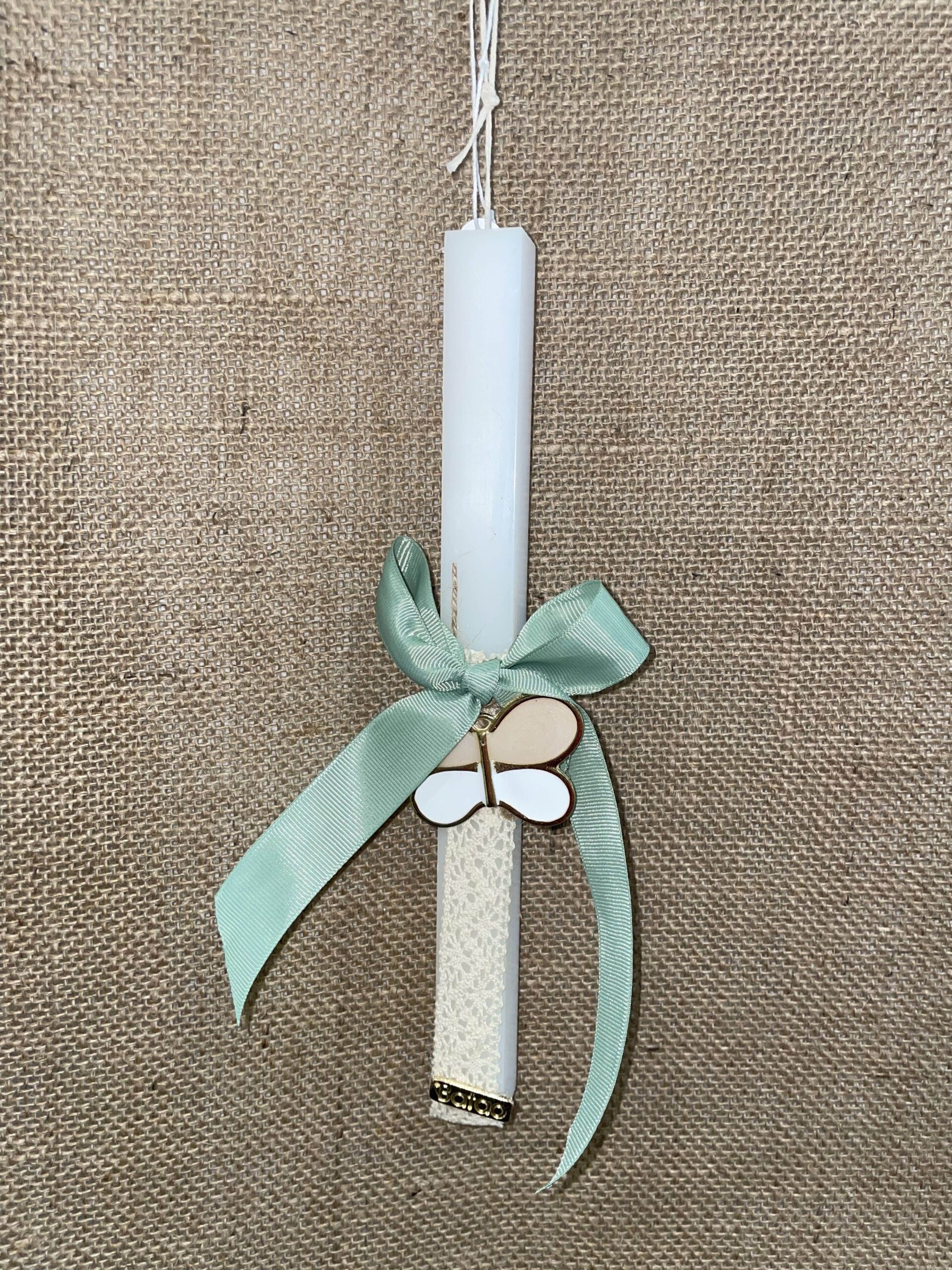 Ετικέτα: Λευκή τετράγωνη λαμπάδα με πεταλούδα μεταλλική κρεμαστή και μέντα φιόγκο