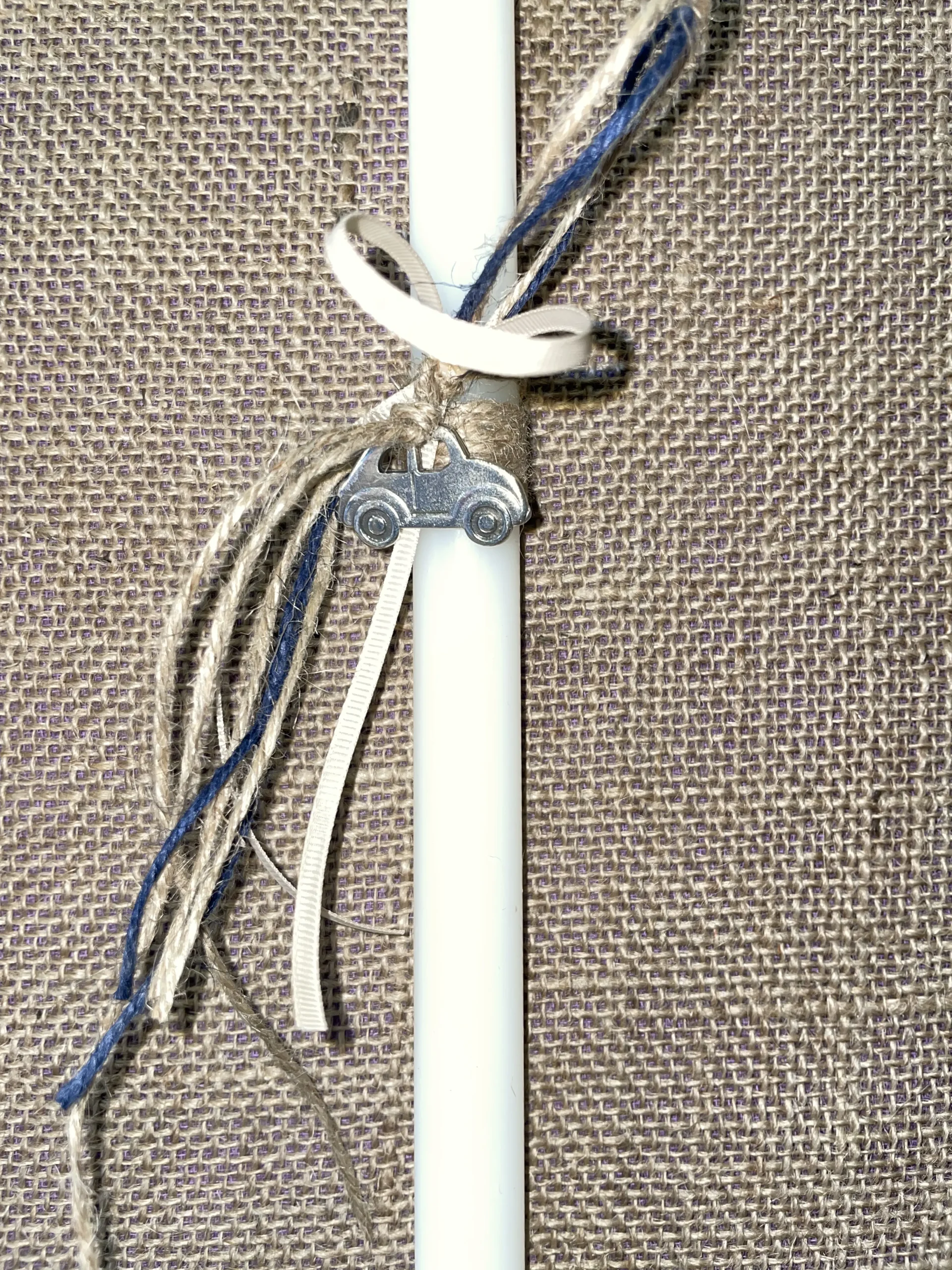 Λευκό στρογγυλό λαμπαδάκι με μεταλλικό αυτοκίνητο