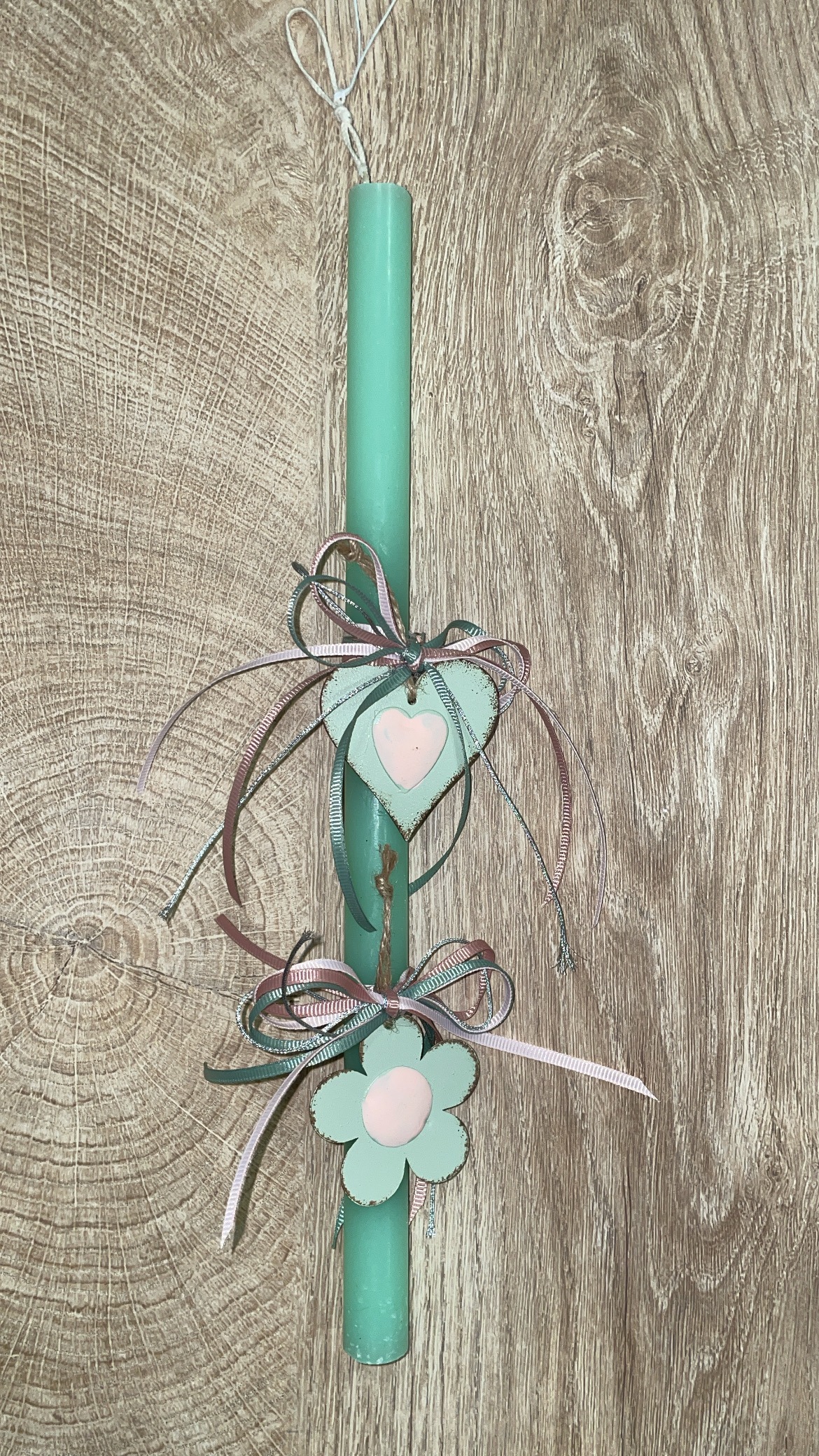 Μέντα στρογγυλή λαμπάδα με μεταλλικό λουλούδι και καρδιά