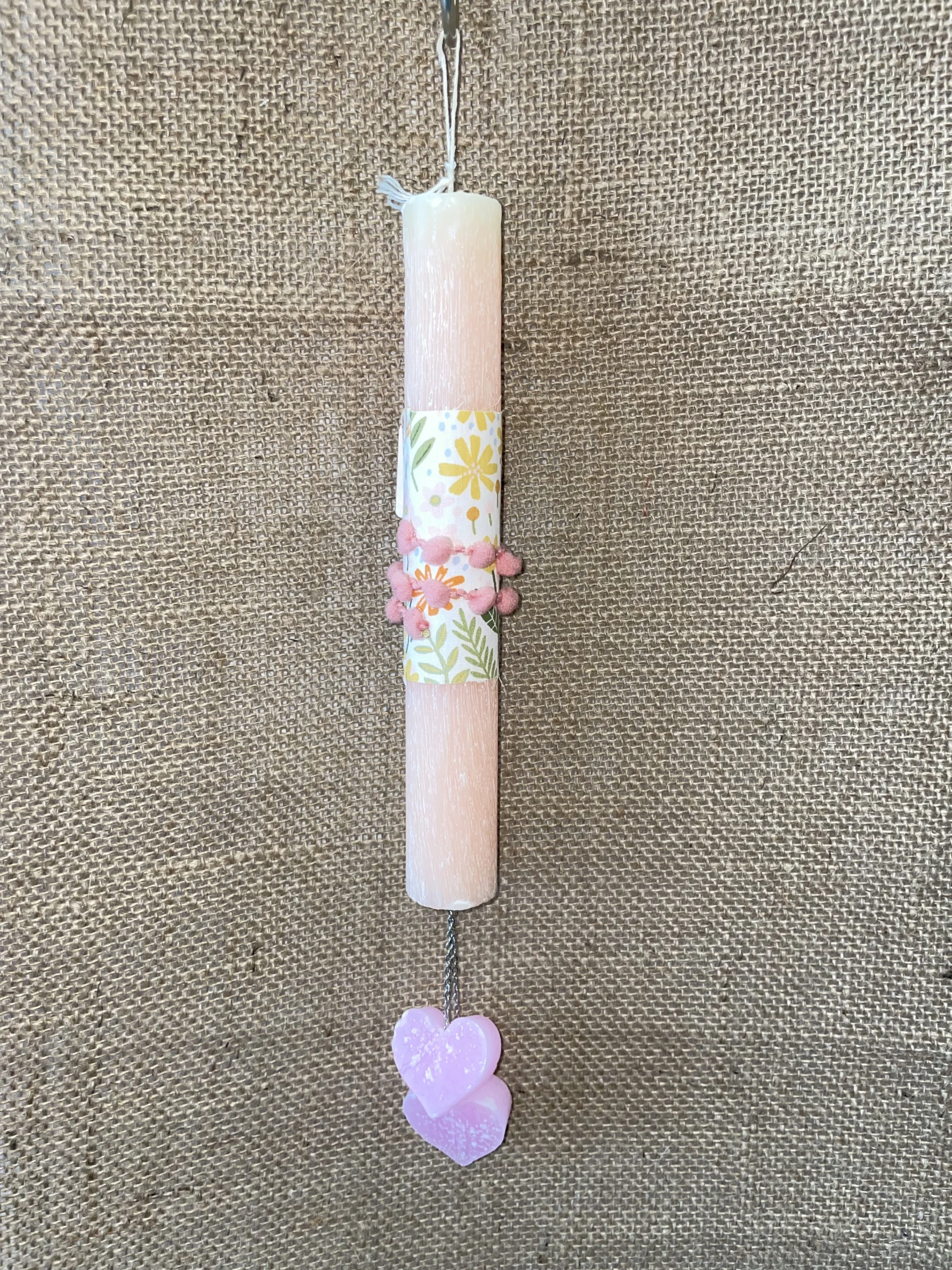 Μπεζ/σωμόν στρογγυλή αρωματική λαμπάδα με εμπριμέ ύφασμα και 2 καρδιές που κρέμονται
