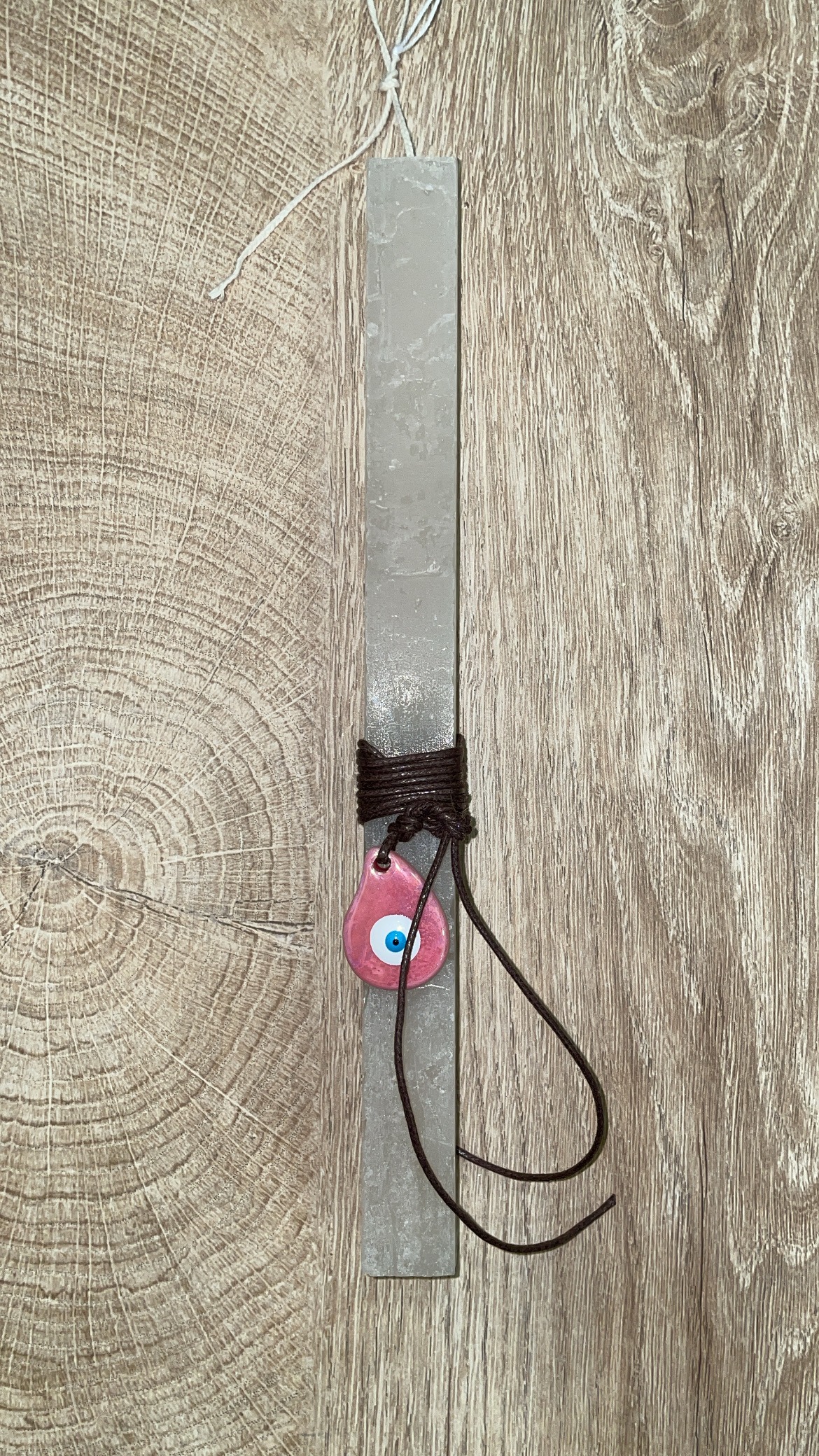 Μπεζ τετράγωνη λαμπάδα με κρεμαστό ματάκι για τον λαιμό