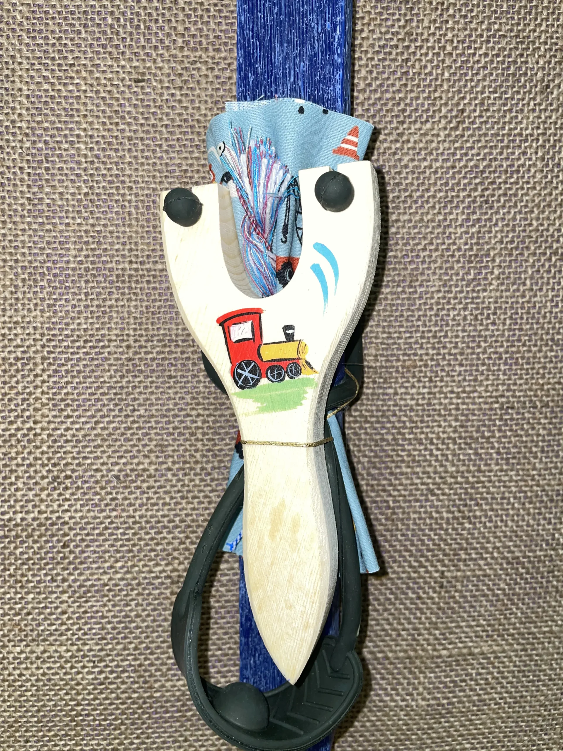 Μπλε πλακέ αρωματική λαμπάδα με ξύλινη σφεντόνα και τρένο