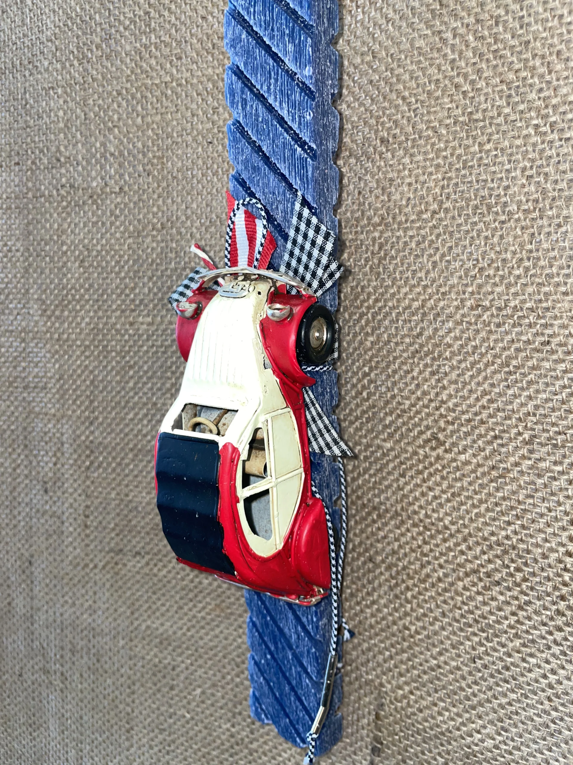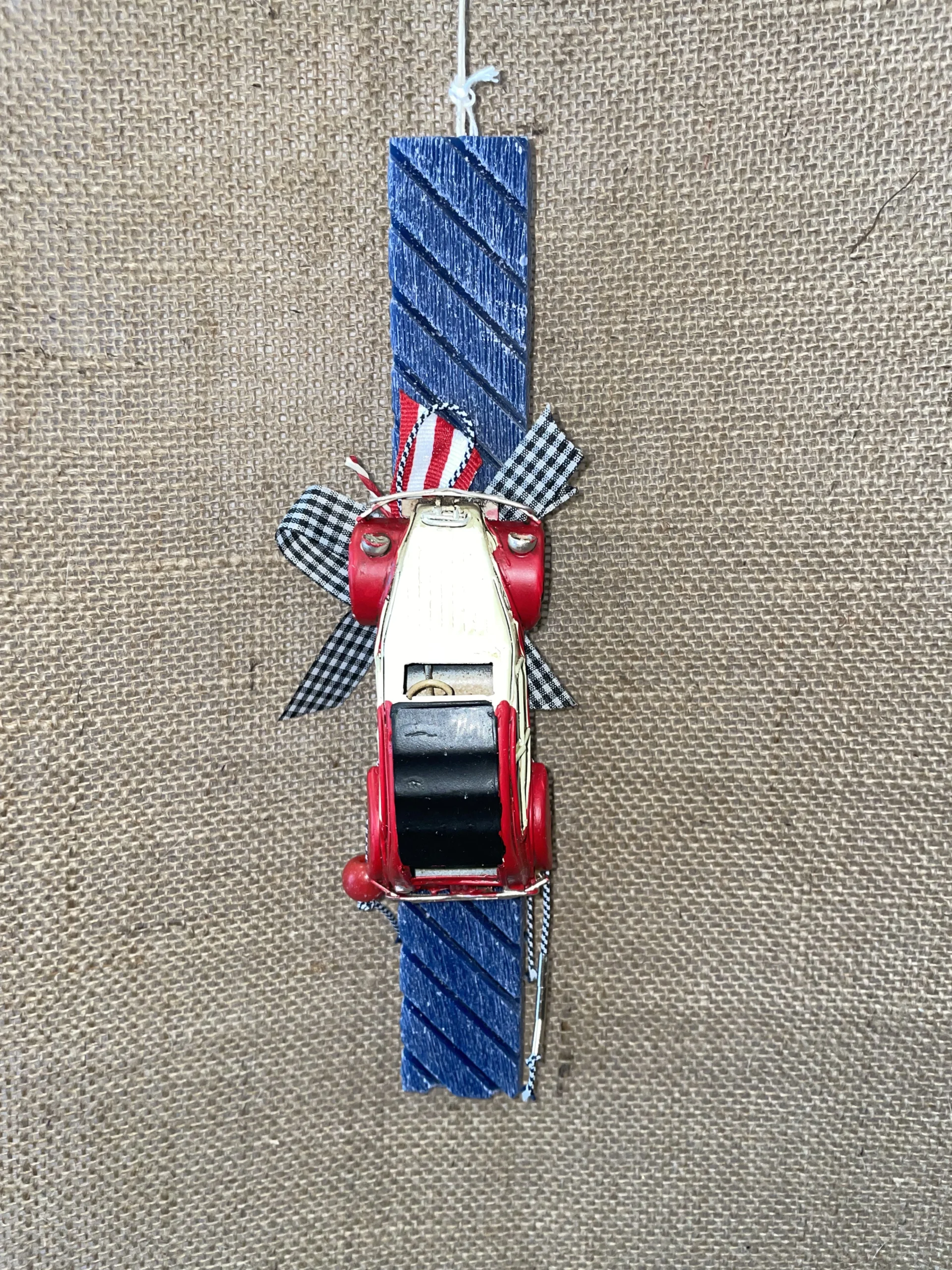 Μπλε πλακέ με ρίγες αρωματική λαμπάδα με διακοσμητικό Vintage αυτοκίνητο