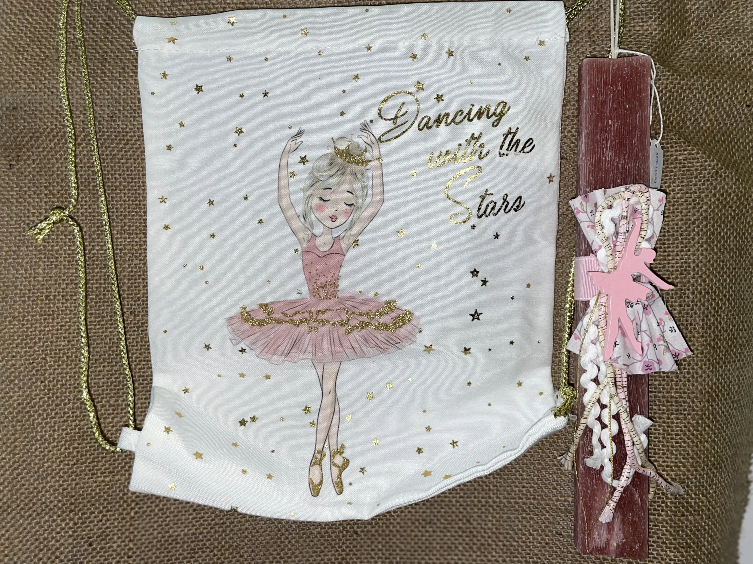 Μπορντώ πλακέ αρωματική λαμπάδα με ξύλινη διακοσμητική μπαλαρίνα μαζί με παιδικό σακίδιο πλάτης