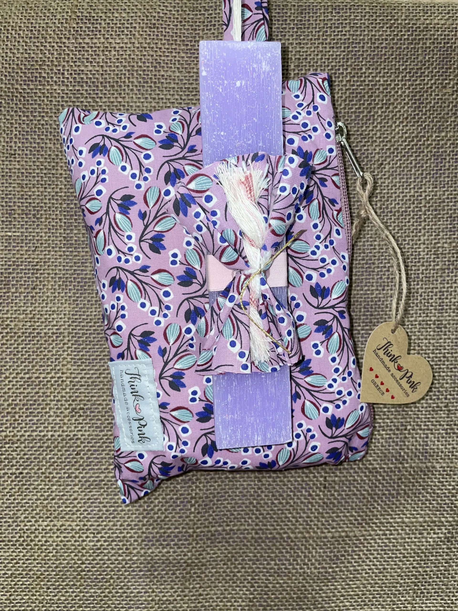 Μωβ πλακέ αρωματική λαμπάδα με μωβ ύφασμα με πράσινα φύλλα και ίδιο τσαντάκι