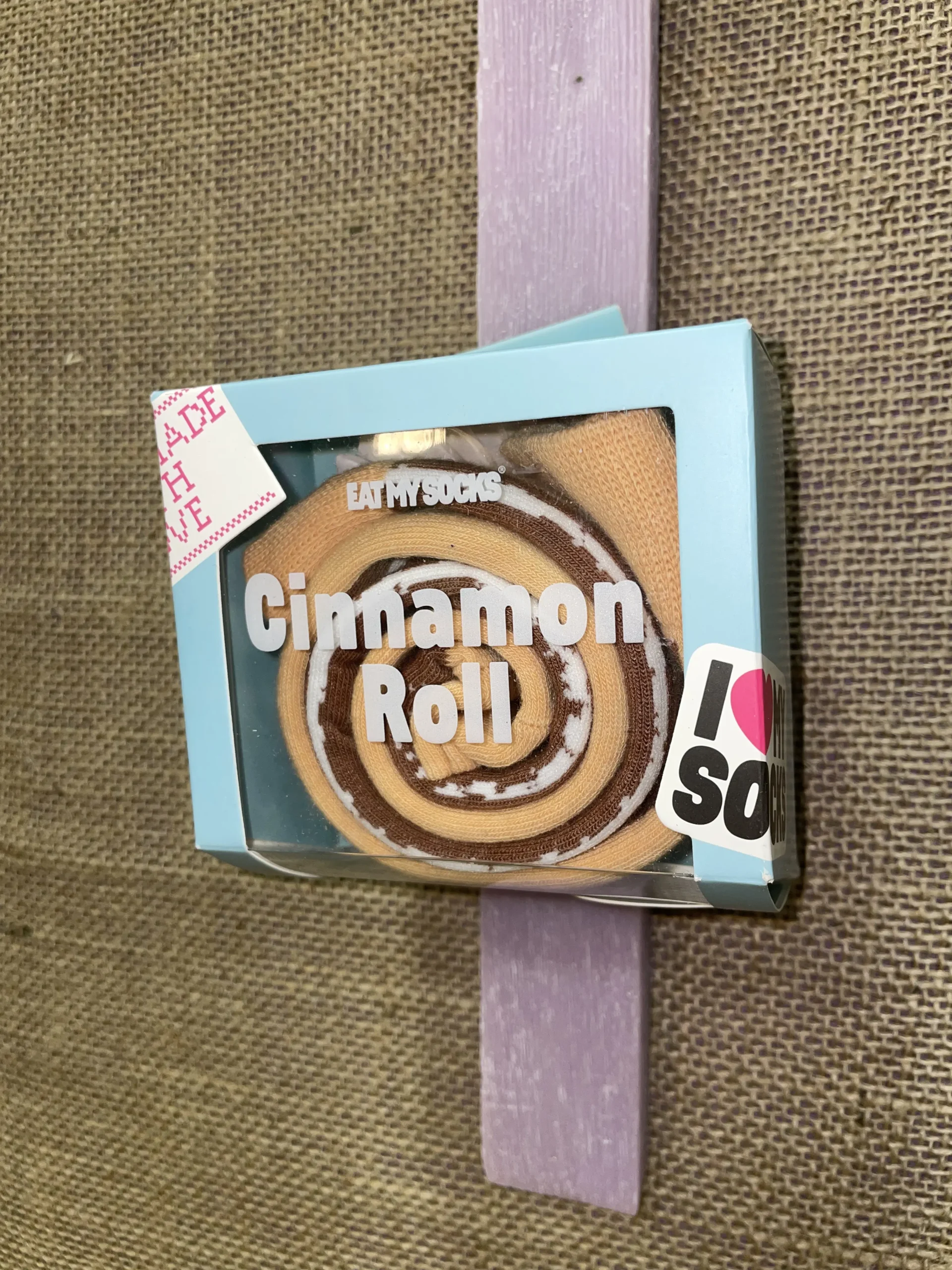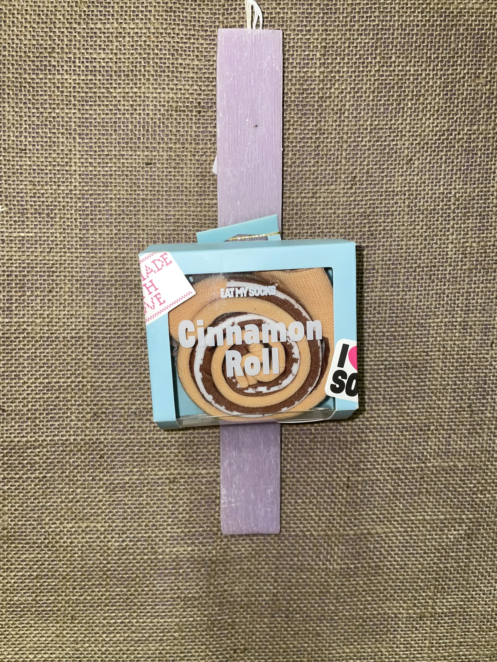 Ετικέτα: Μωβ πλακέ αρωματική λαμπάδα με πολύχρωμες κάλτσες ''Cinnamon Roll''