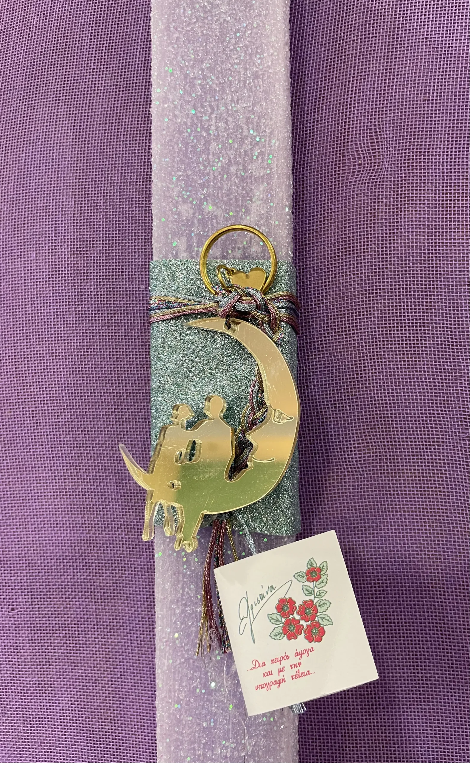 Μωβ πλακέ ιριζέ λαμπάδα με χρυσό ζευγάρι από plexiglass