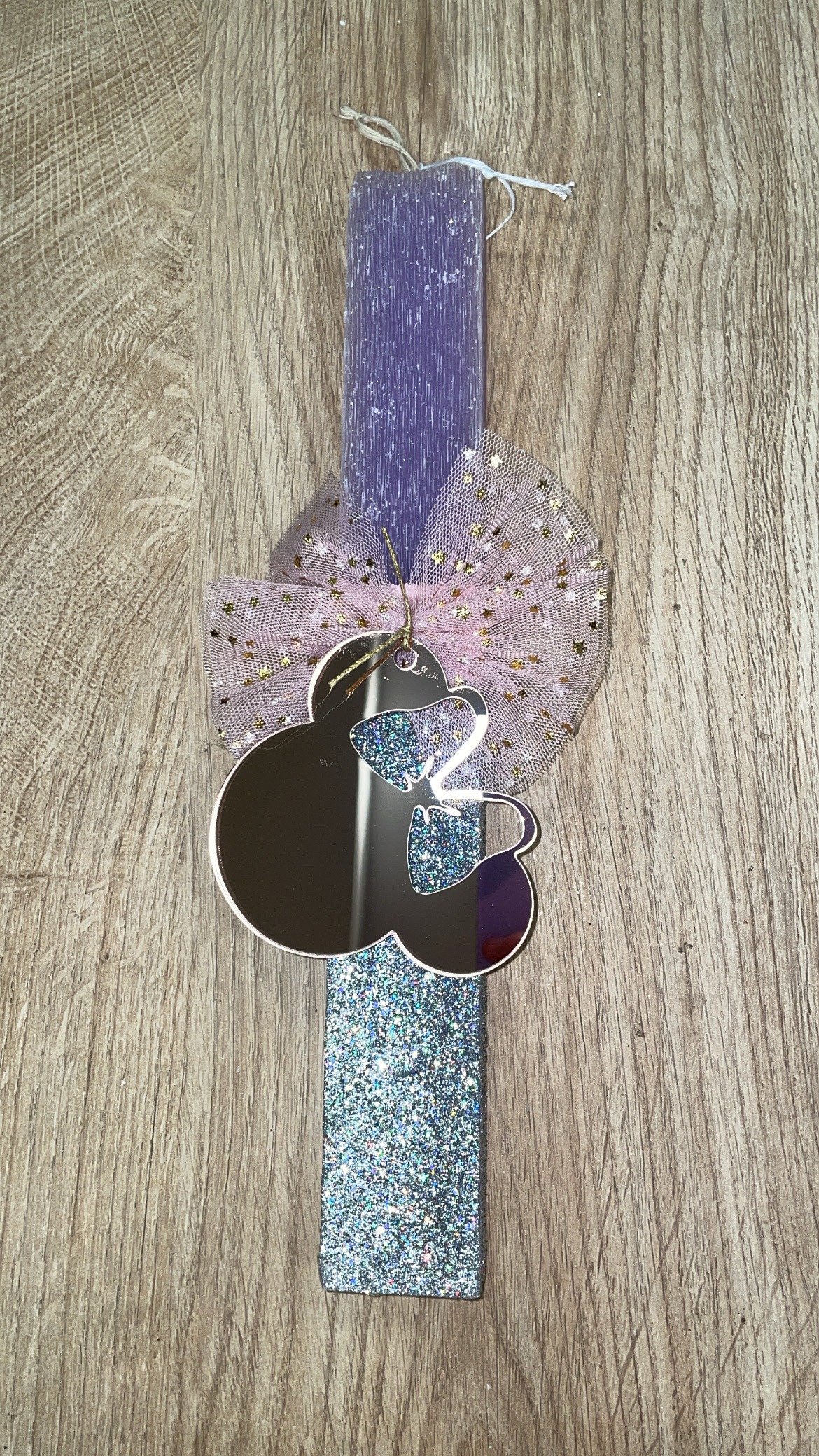 Μωβ πλακέ λαμπάδα με πλεξιγκλάς ροζ καθρεφτάκι Minnie