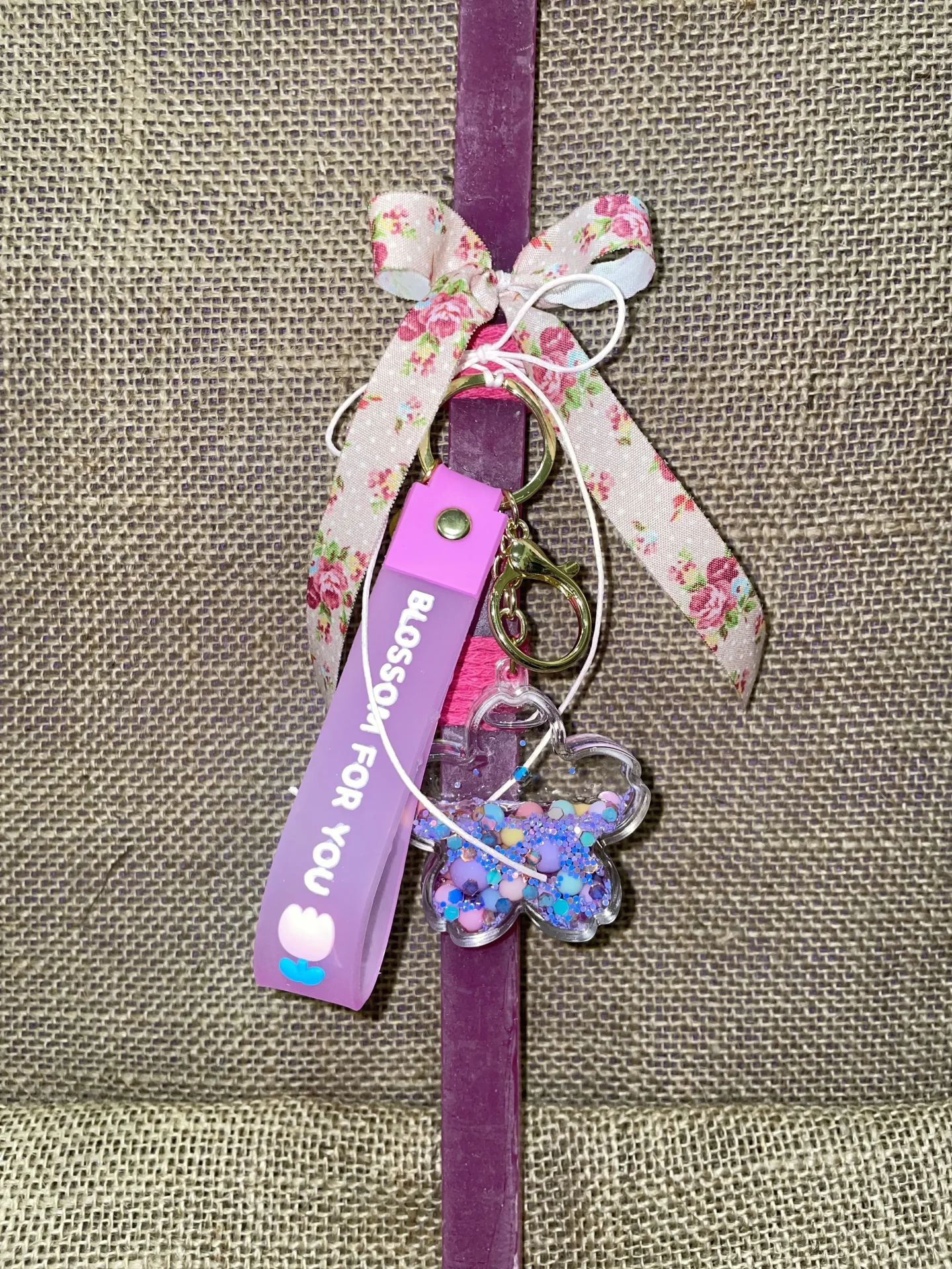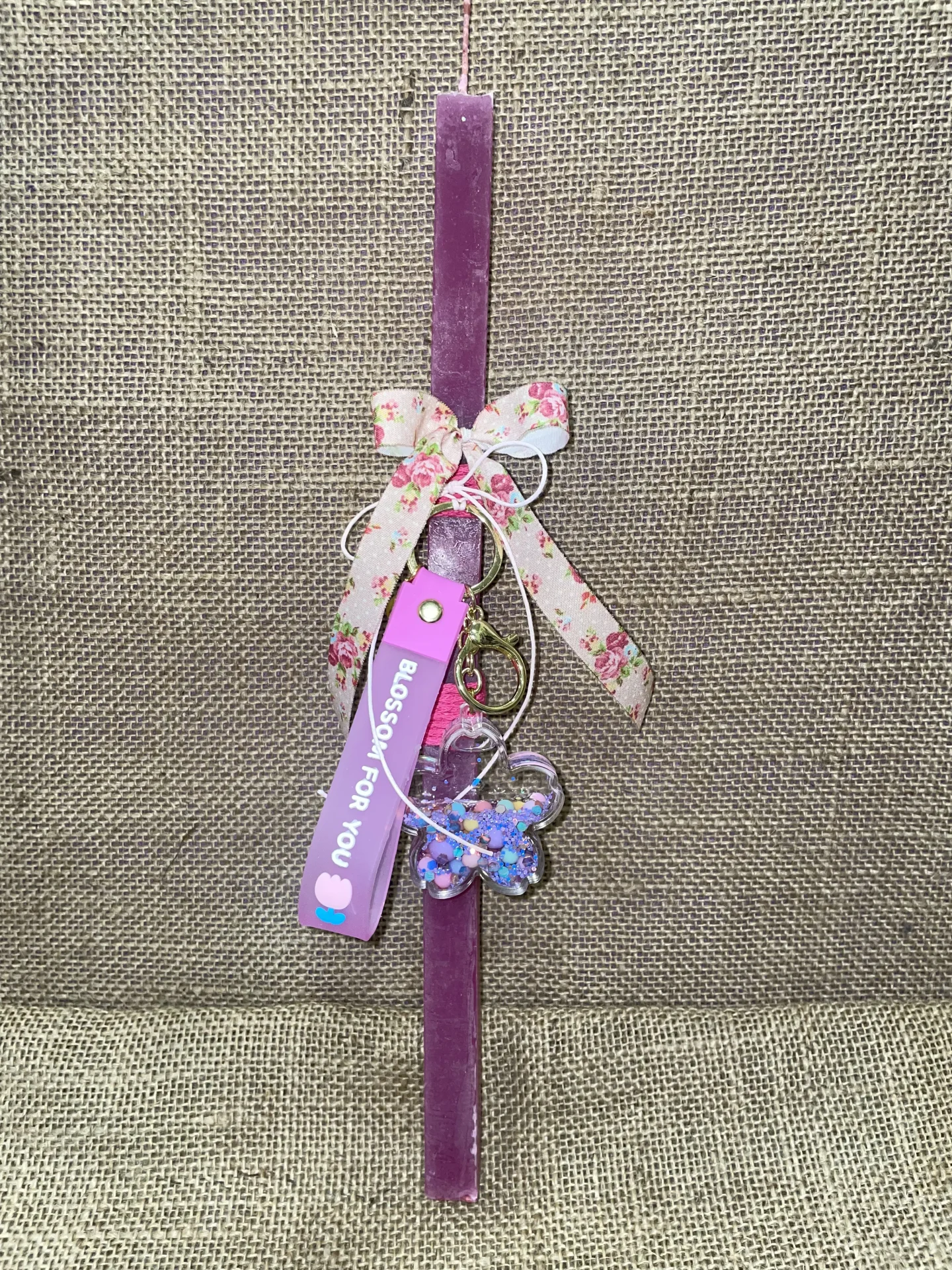 Μωβ τετράγωνη λαμπάδα με μπρελόκ μαργαρίτα με πολύχρωμα μπαλάκια