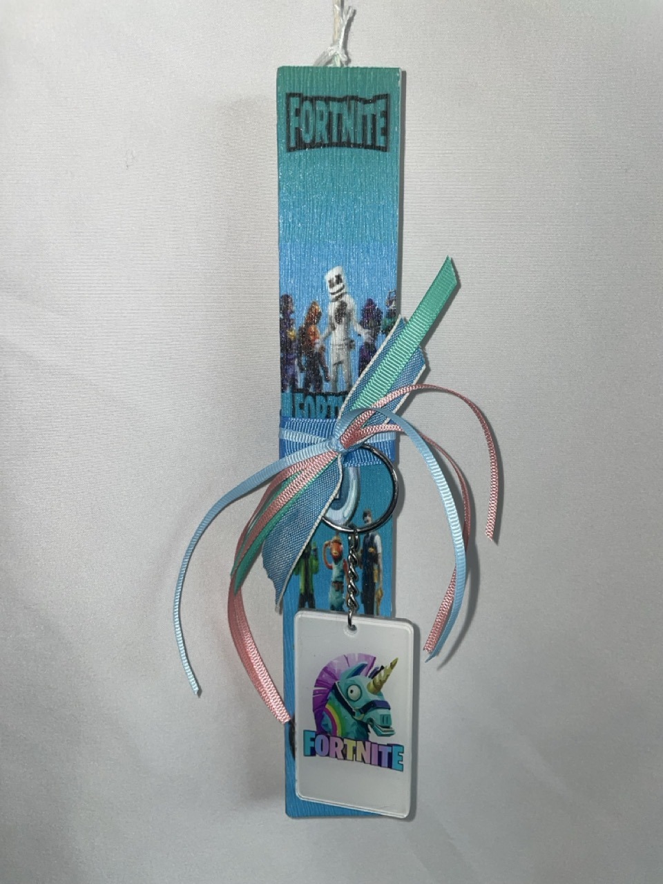 Λαμπάδα πλακέ με ντεκουπάζ με θέμα Fortnite και μπρελόκ