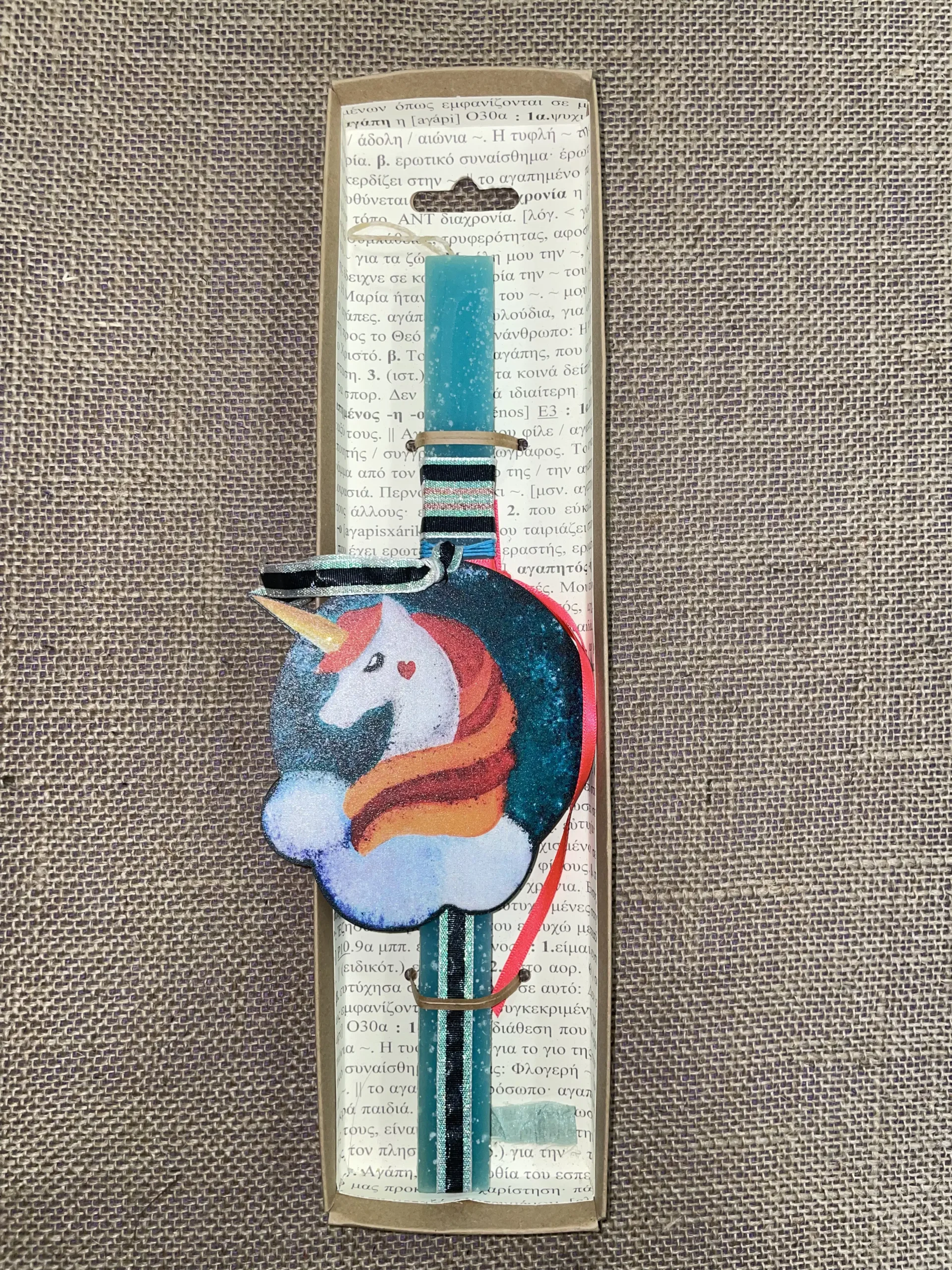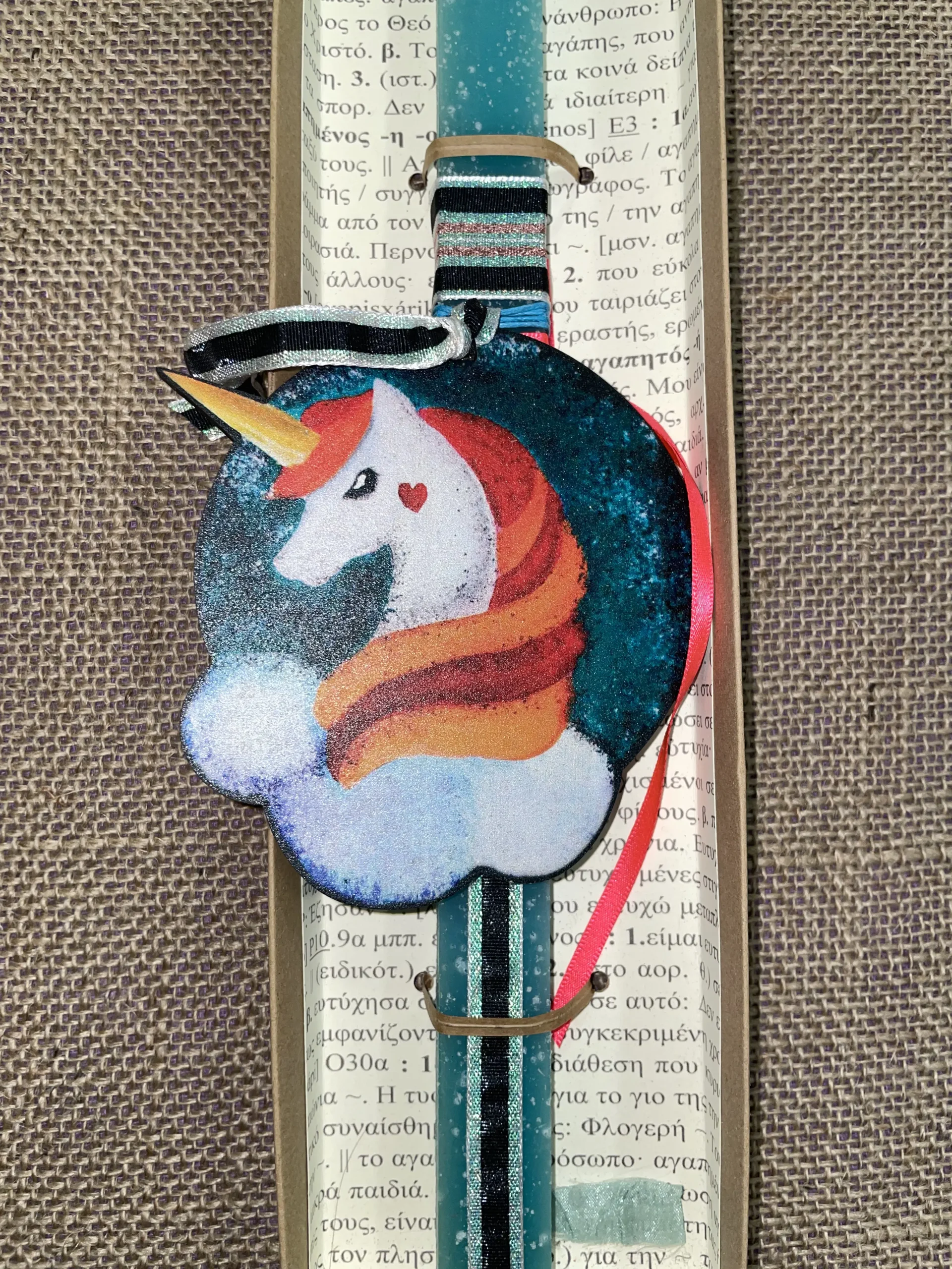 Ετικέτα: Πλακέ πιτσιλωτή λαμπάδα με ξύλινο κρεμαστό μονόκερο