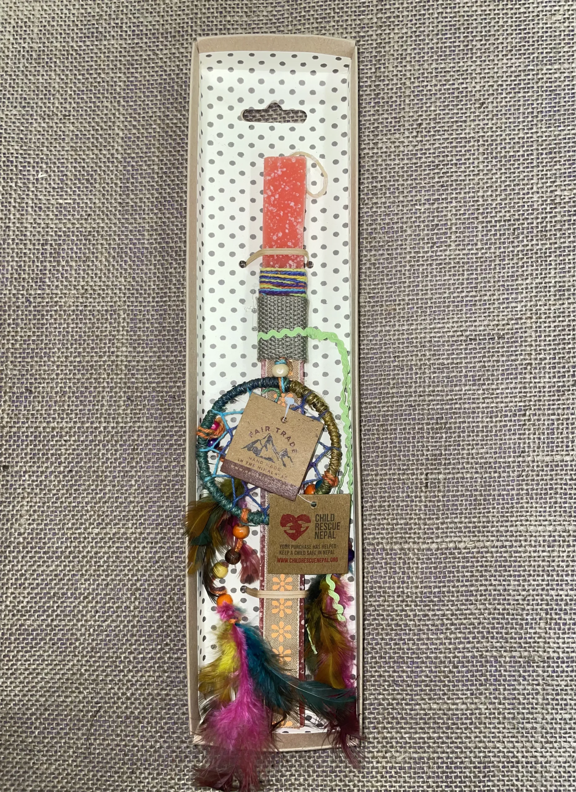 Πορτοκαλί πλακέ πιστιλωτή λαμπάδα με κρεμαστή πολύχρωμη ονειροπαγίδα
