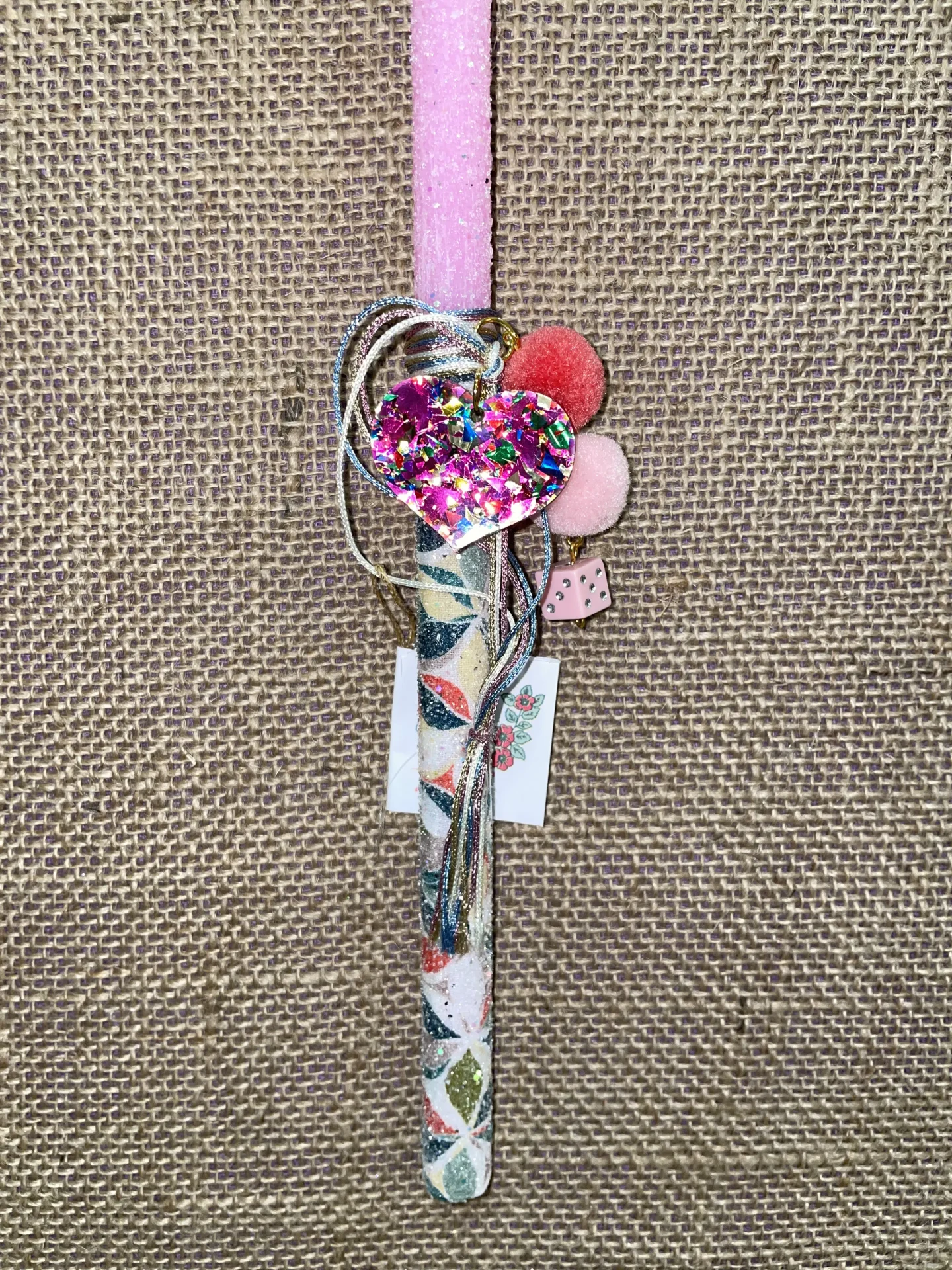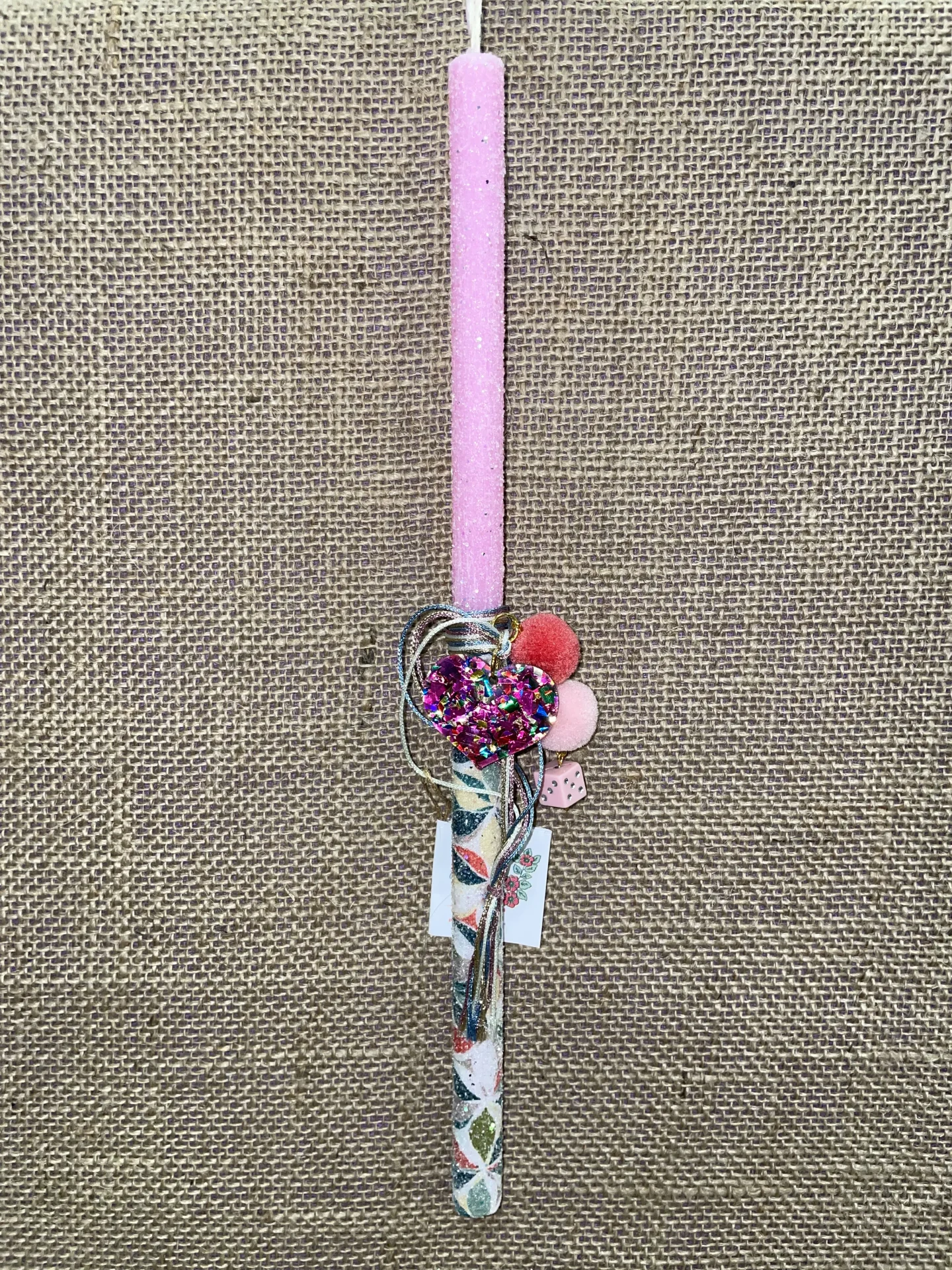 Ετικέτα: Ροζ ιριζέ λαμπάδα με κρεμαστή καρδιά πολύχρωμη και ζάρι