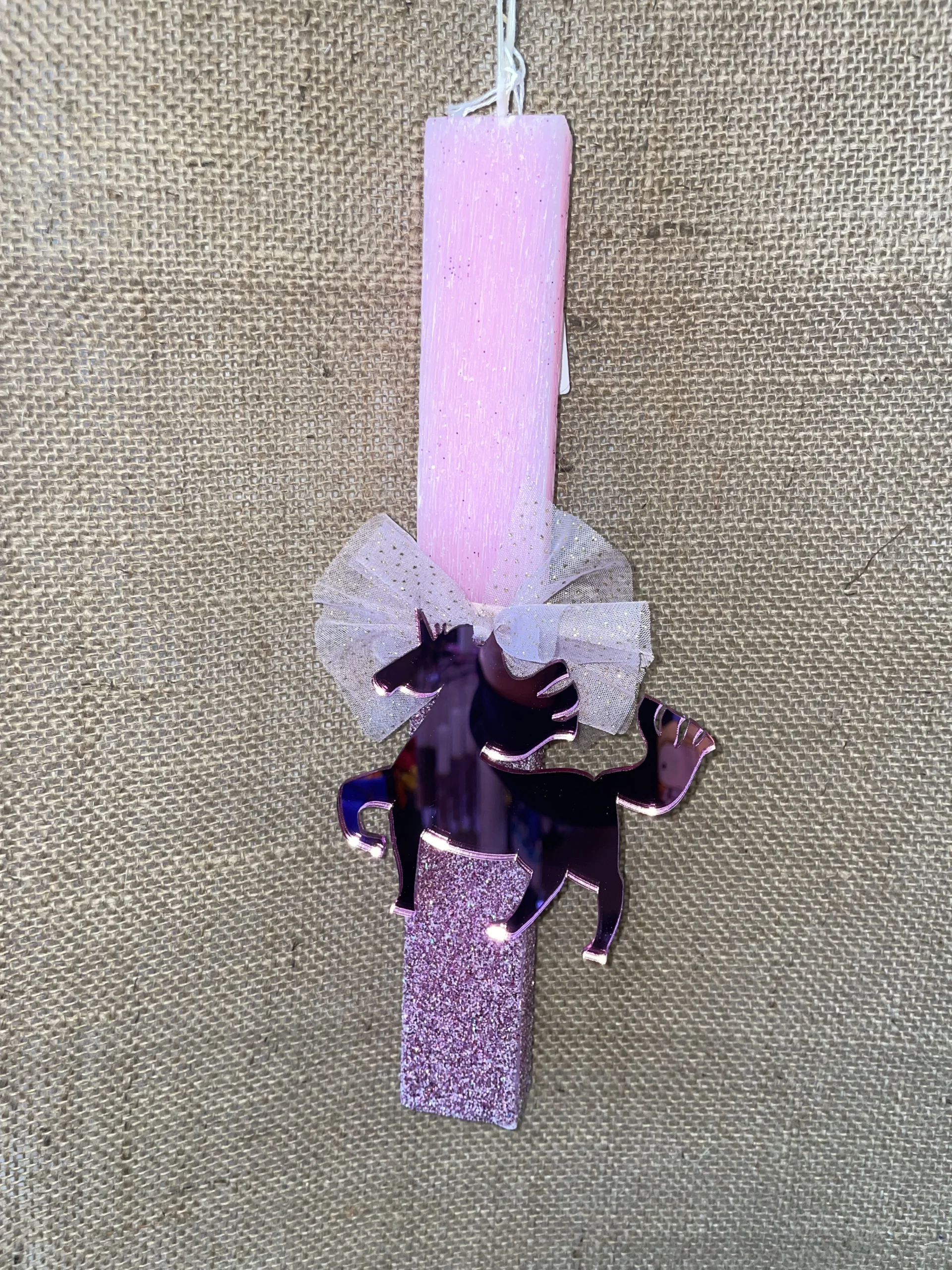 Ροζ πλακέ αρωματική λαμπάδα, μισή ιριζέ, με plexiglass καθρέφτη μονόκερο