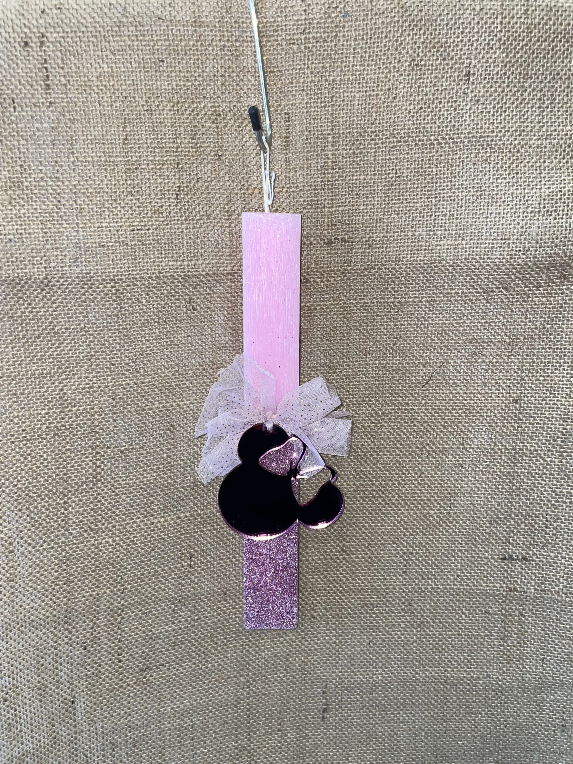 Ροζ πλακέ αρωματική λαμπάδα, μισή ιριζέ, με plexiglass καθρέφτη Minnie