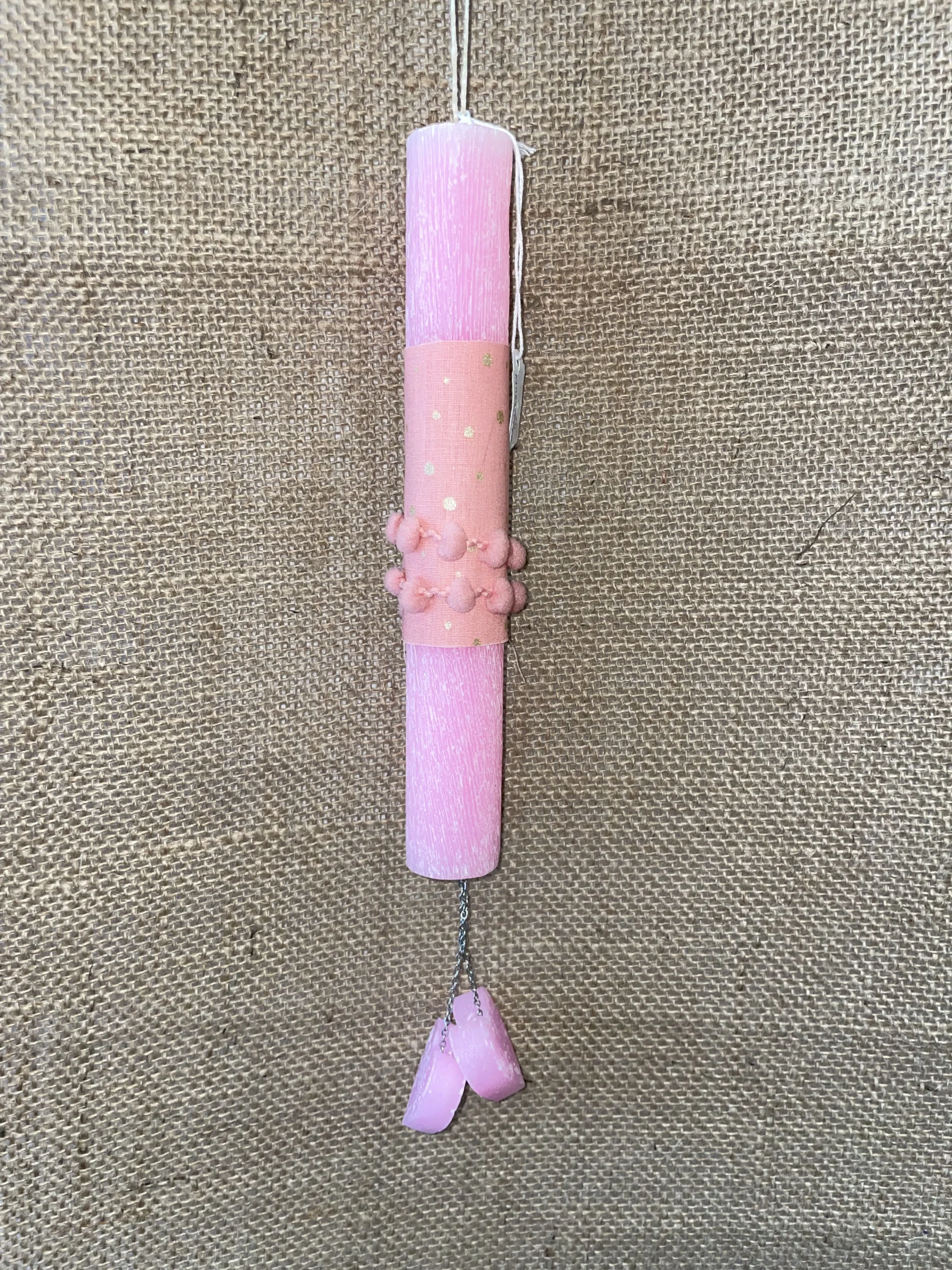 Ετικέτα: Ροζ στρογγυλή αρωματική λαμπάδα με πουά ύφασμα και 2 καρδιές που κρέμονται