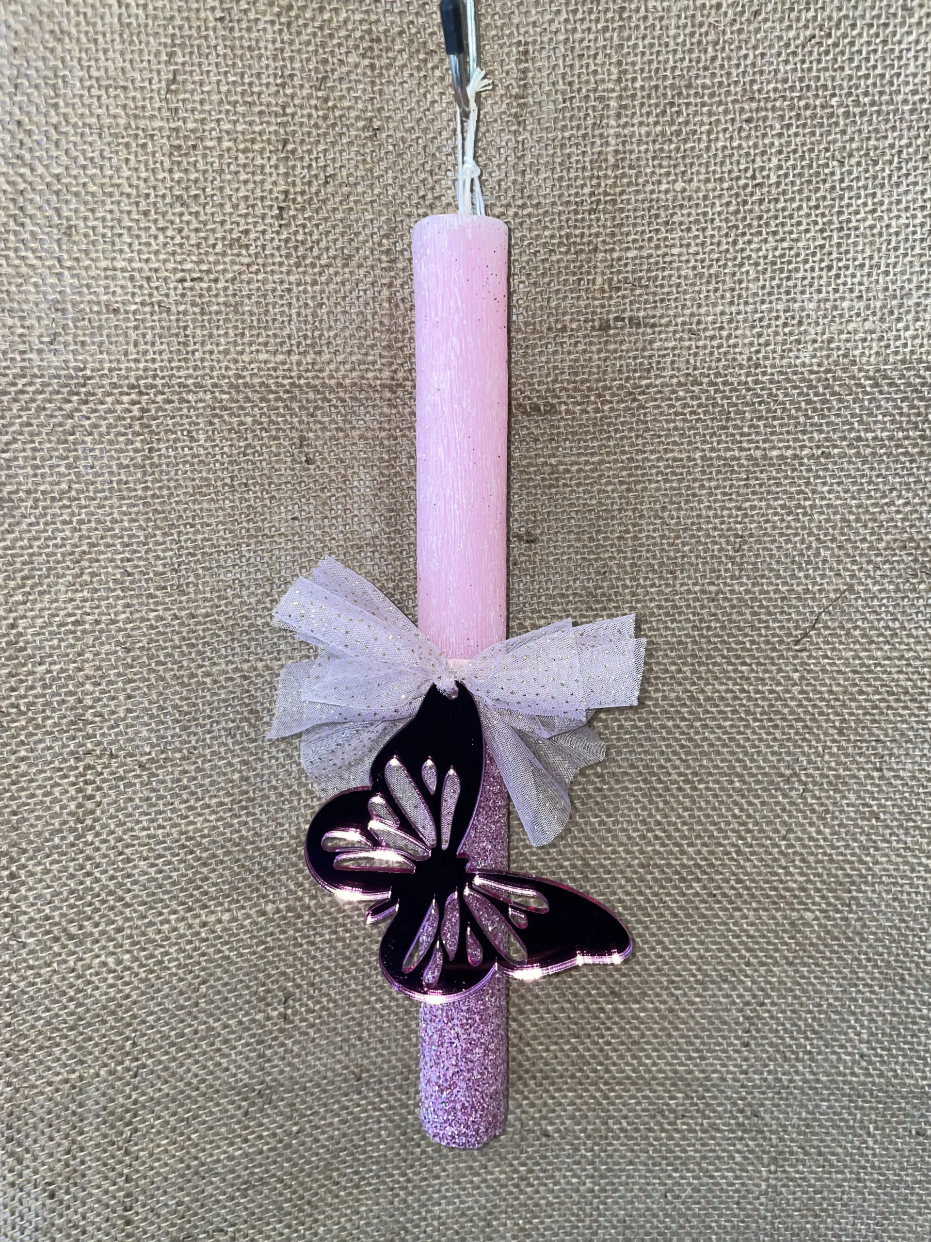 Ροζ στρογγυλή αρωματική λαμπάδα, μισή ιριζέ, με plexiglass καθρέφτη πεταλούδα