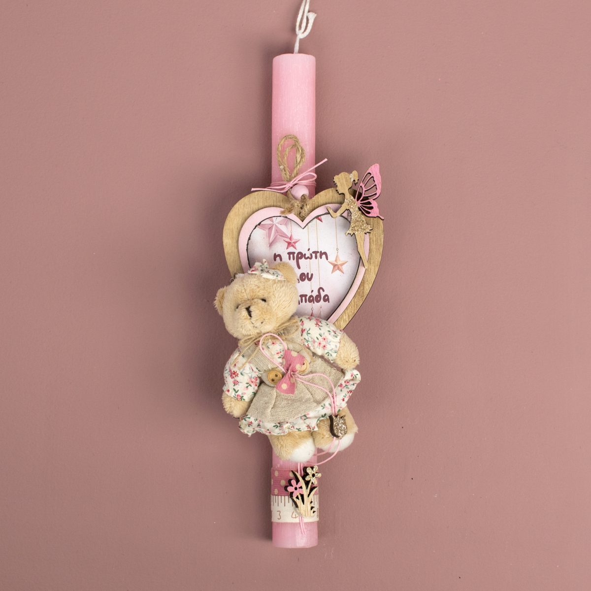 Ροζ στρογγυλή λαμπάδα με αρκουδάκι και κάδρο ”Η πρώτη μου λαμπάδα”