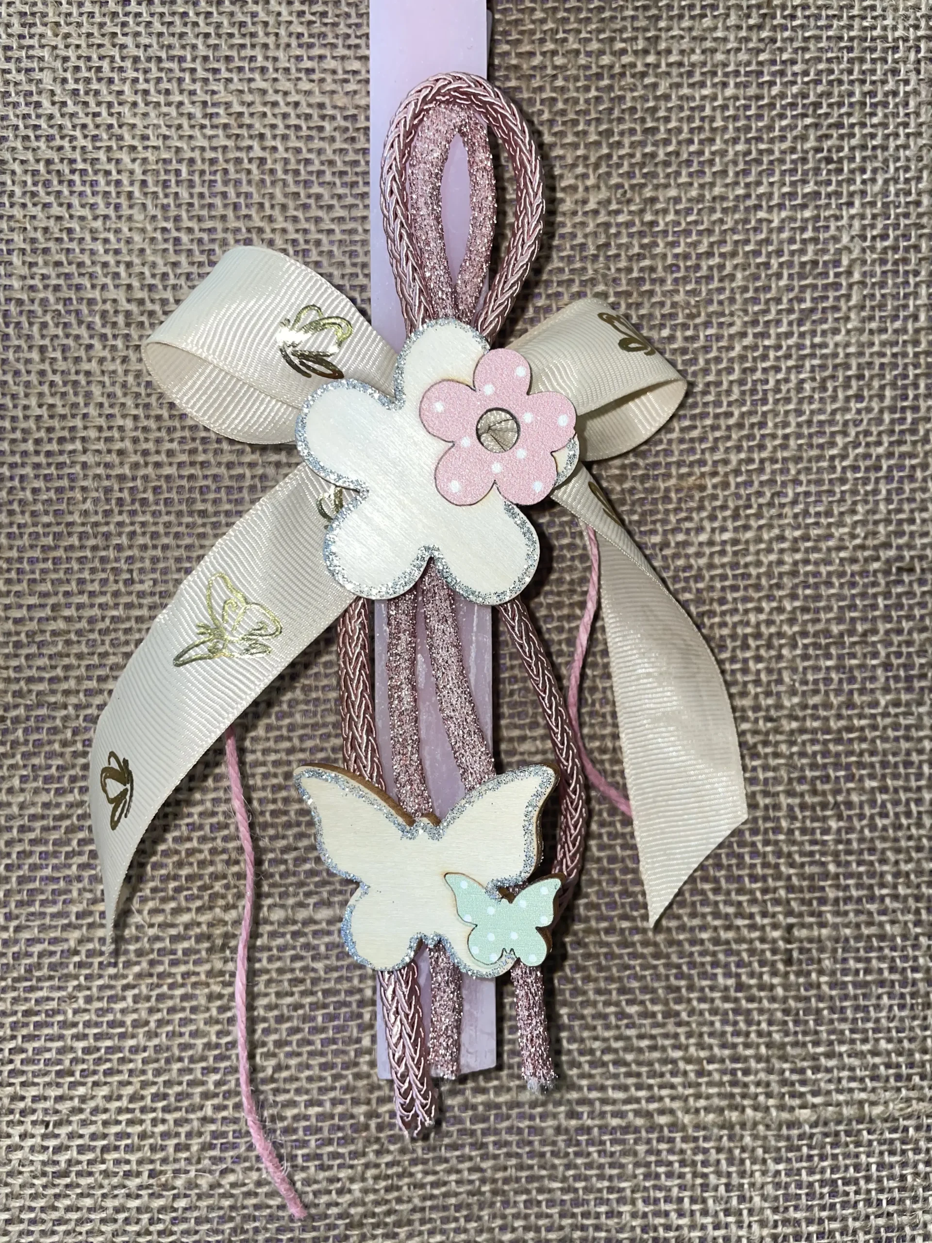 Ροζ τετράγωνη αρωματική λαμπάδα με ξύλινη πεταλούδα και καρδιά 12,50€