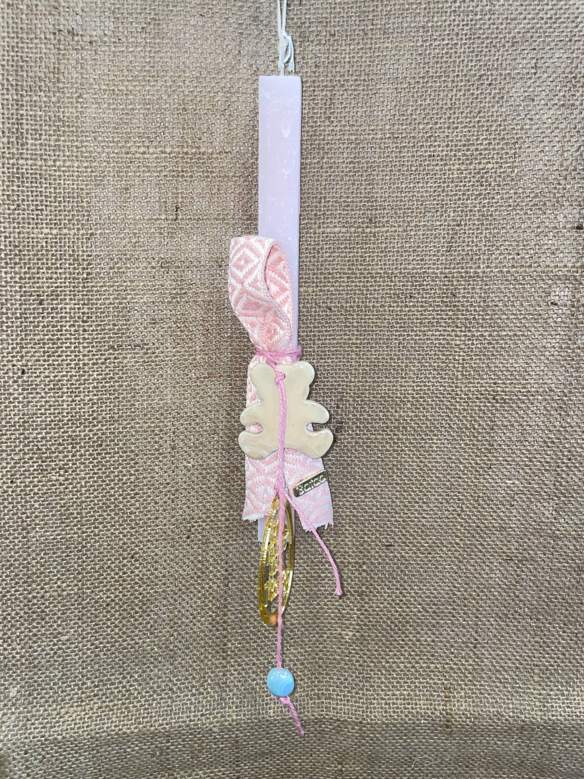 Ετικέτα: Ροζ τετράγωνη λαμπάδα με κεραμικό αρκουδάκι και plexiglass αυγό ''Το πρώτο μου Πάσχα''
