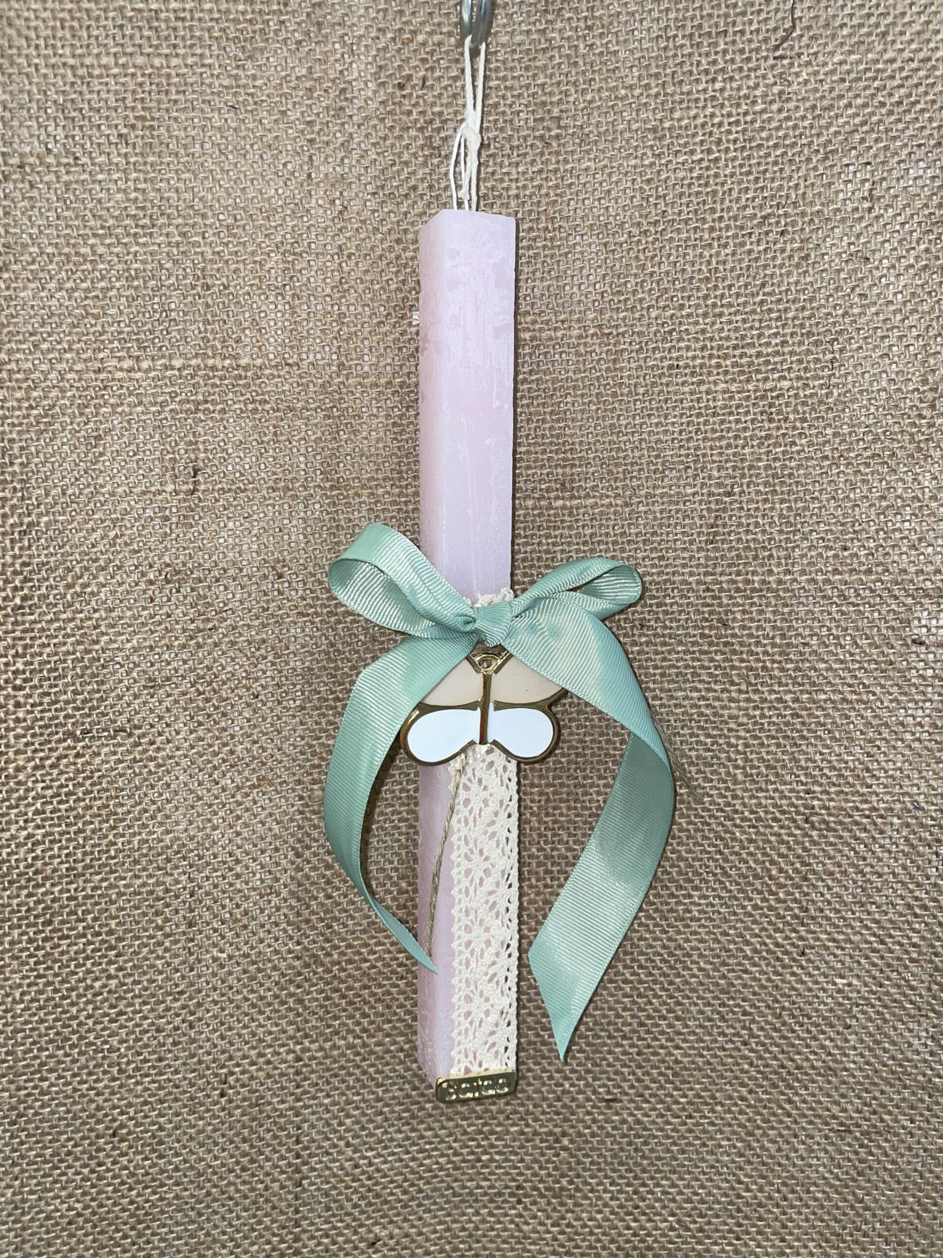 Ετικέτα: Ροζ τετράγωνη λαμπάδα με πεταλούδα μεταλλική κρεμαστή και μέντα φιόγκο
