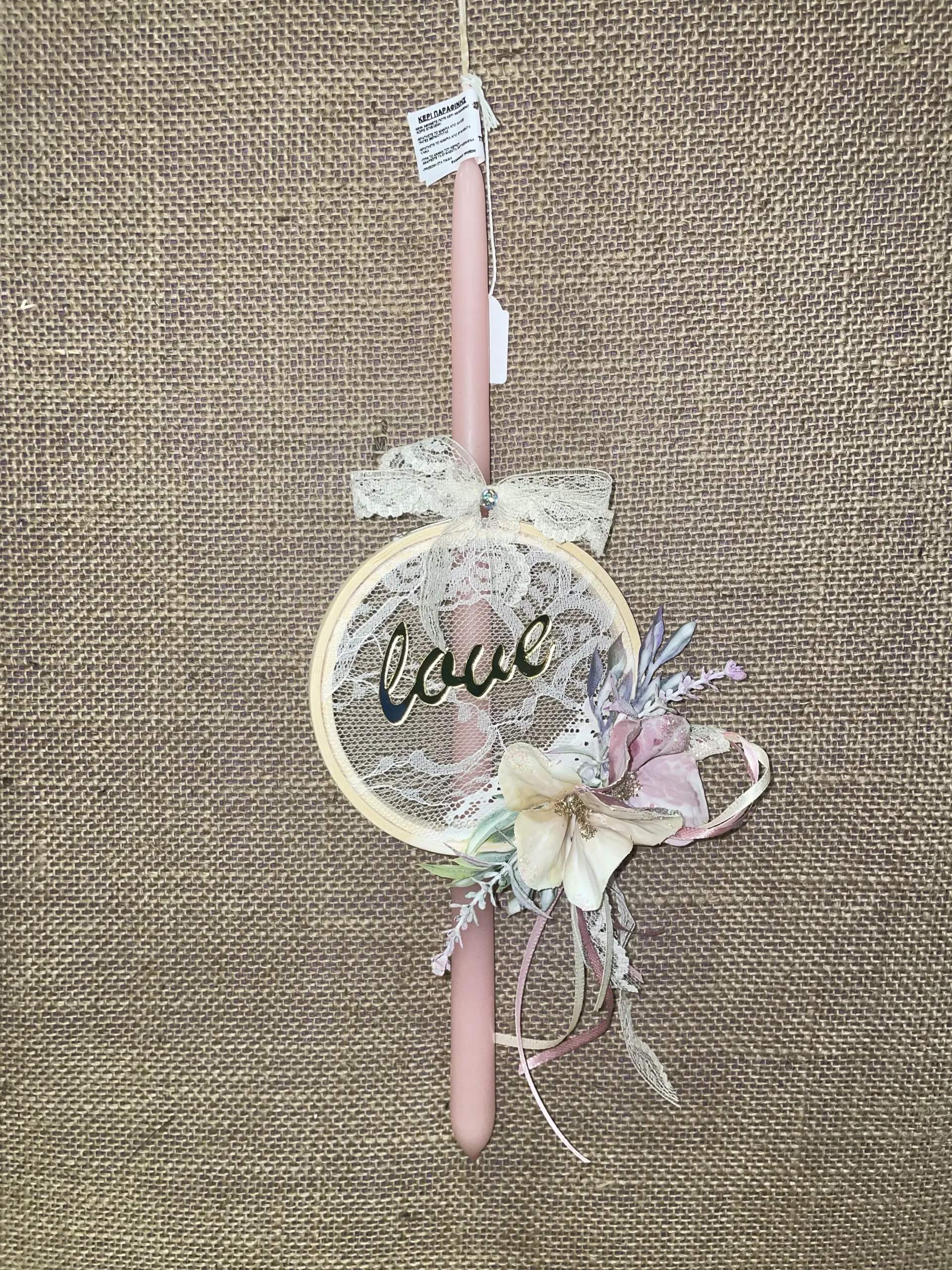 Ετικέτα: Σωμόν στρογγυλό αρωματικό λαμπαδάκι με ξύλινο τελάρο με ''Love'' plexiglass