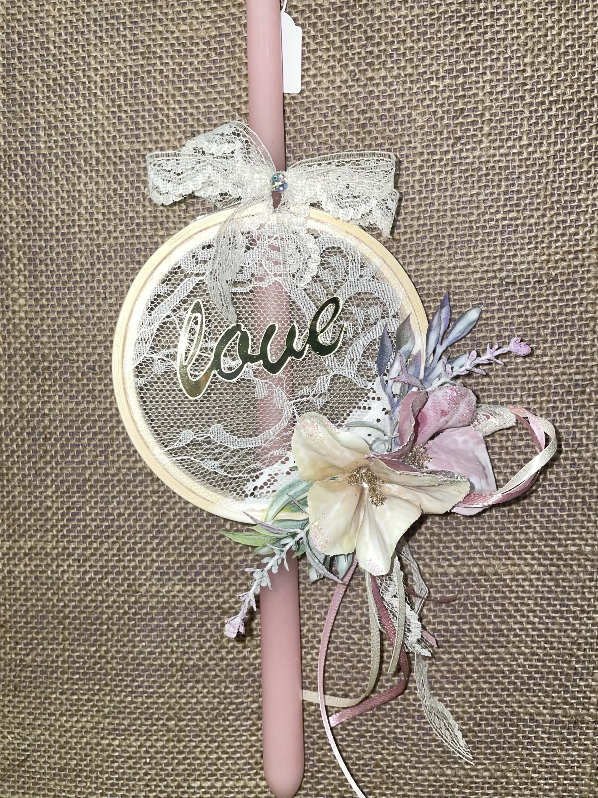Σωμόν στρογγυλό αρωματικό λαμπαδάκι με ξύλινο τελάρο με ”Love” plexiglass
