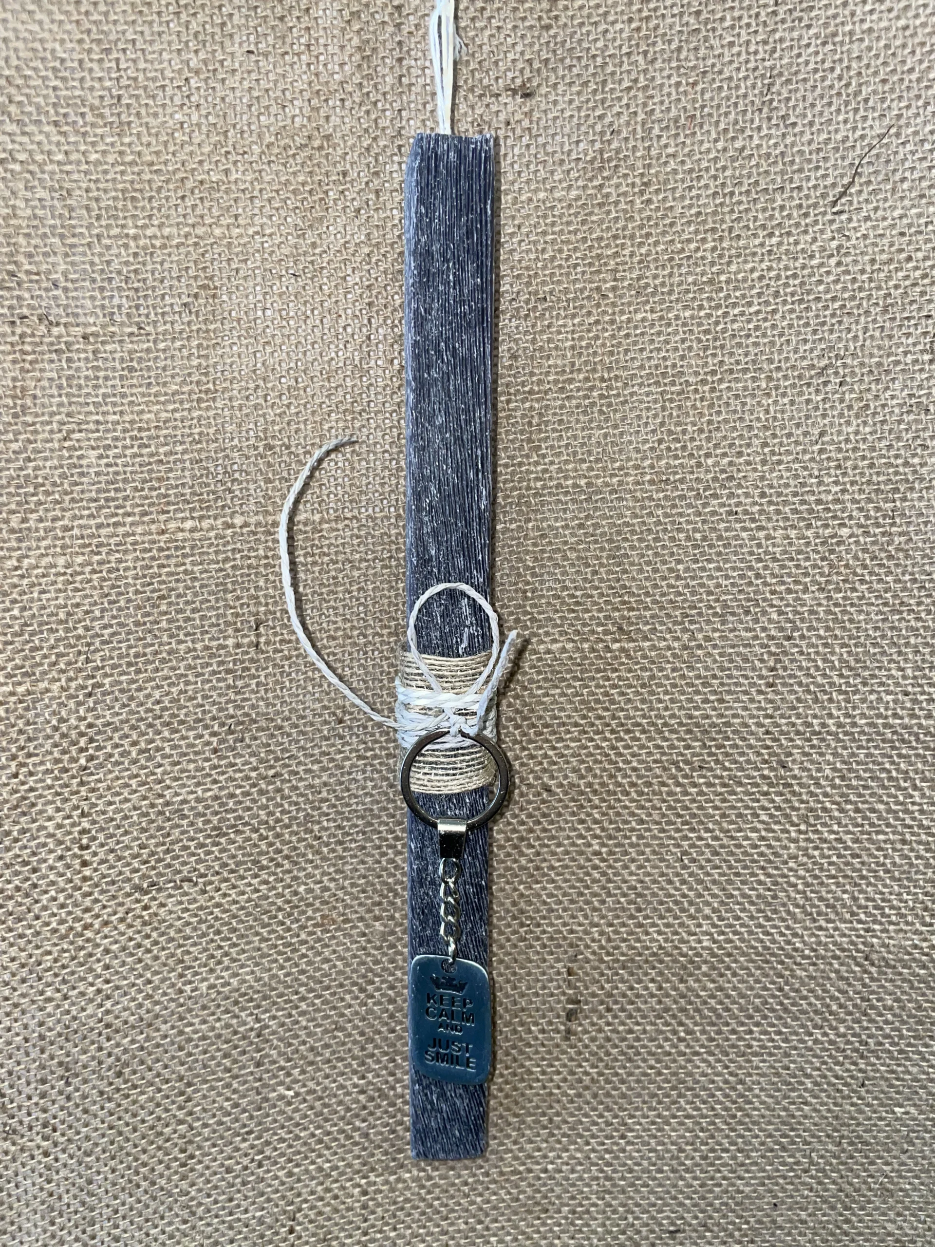 Γκρι τετράγωνη αρωματική λαμπάδα με μεταλλικό μπρελόκ Keep calm and just smile