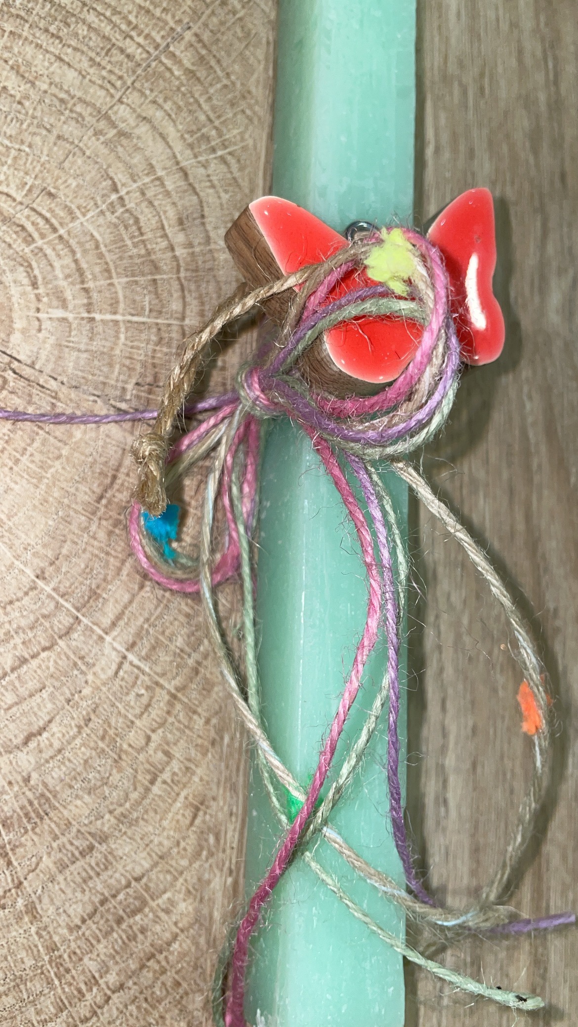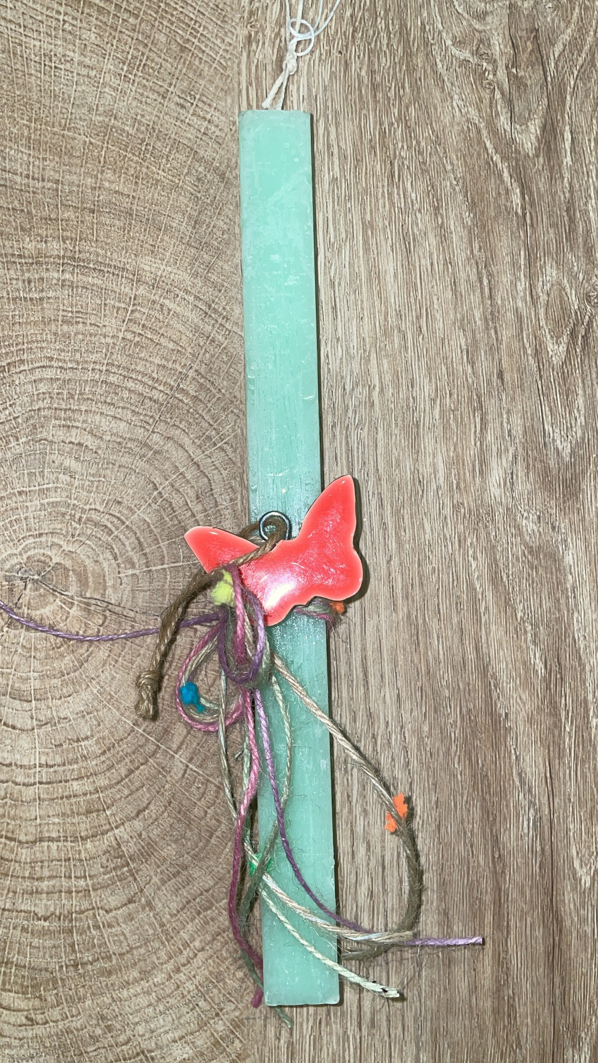 Τετράγωνη γαλάζια λαμπάδα με ξύλινη κόκκινη πεταλούδα