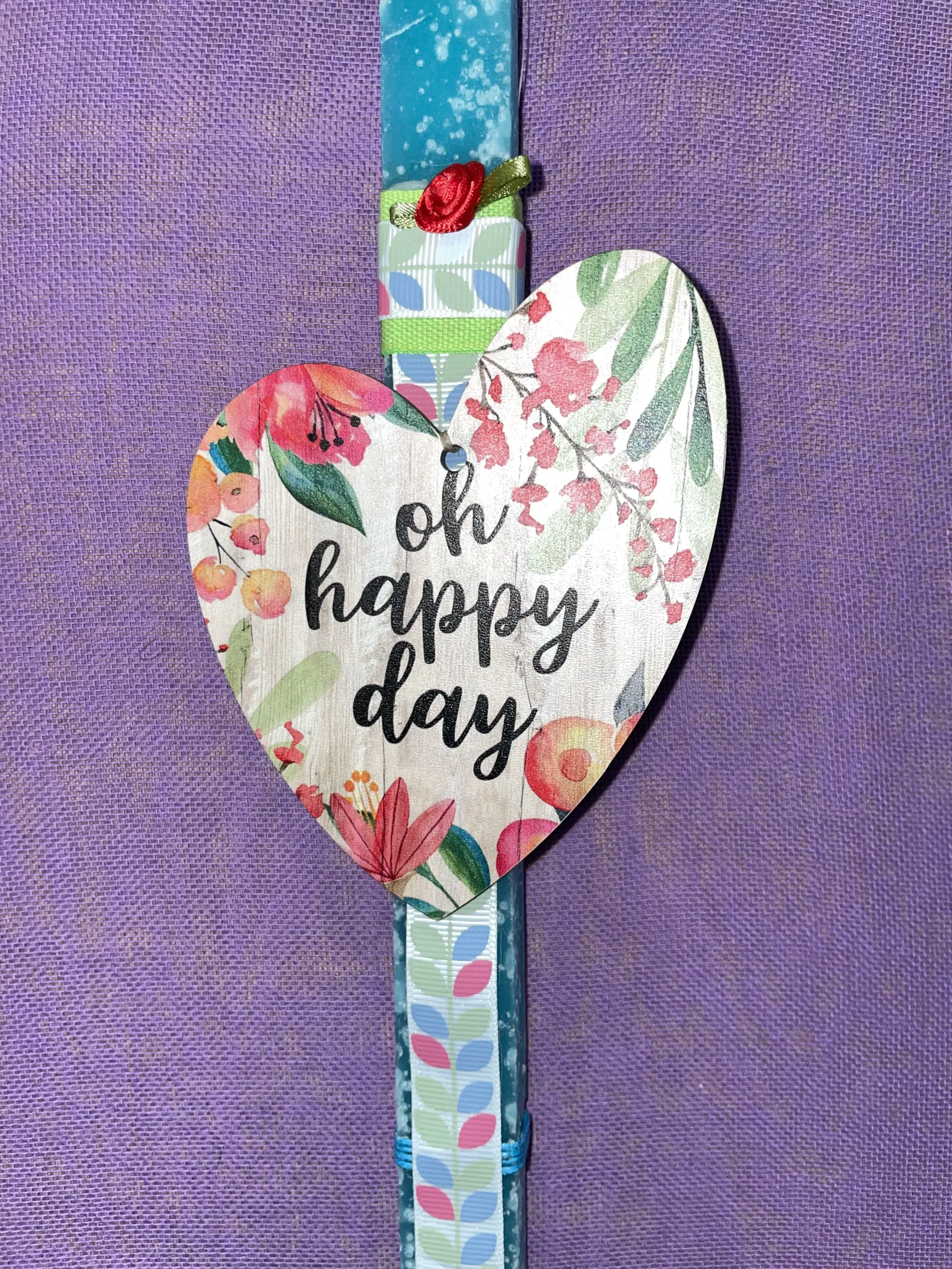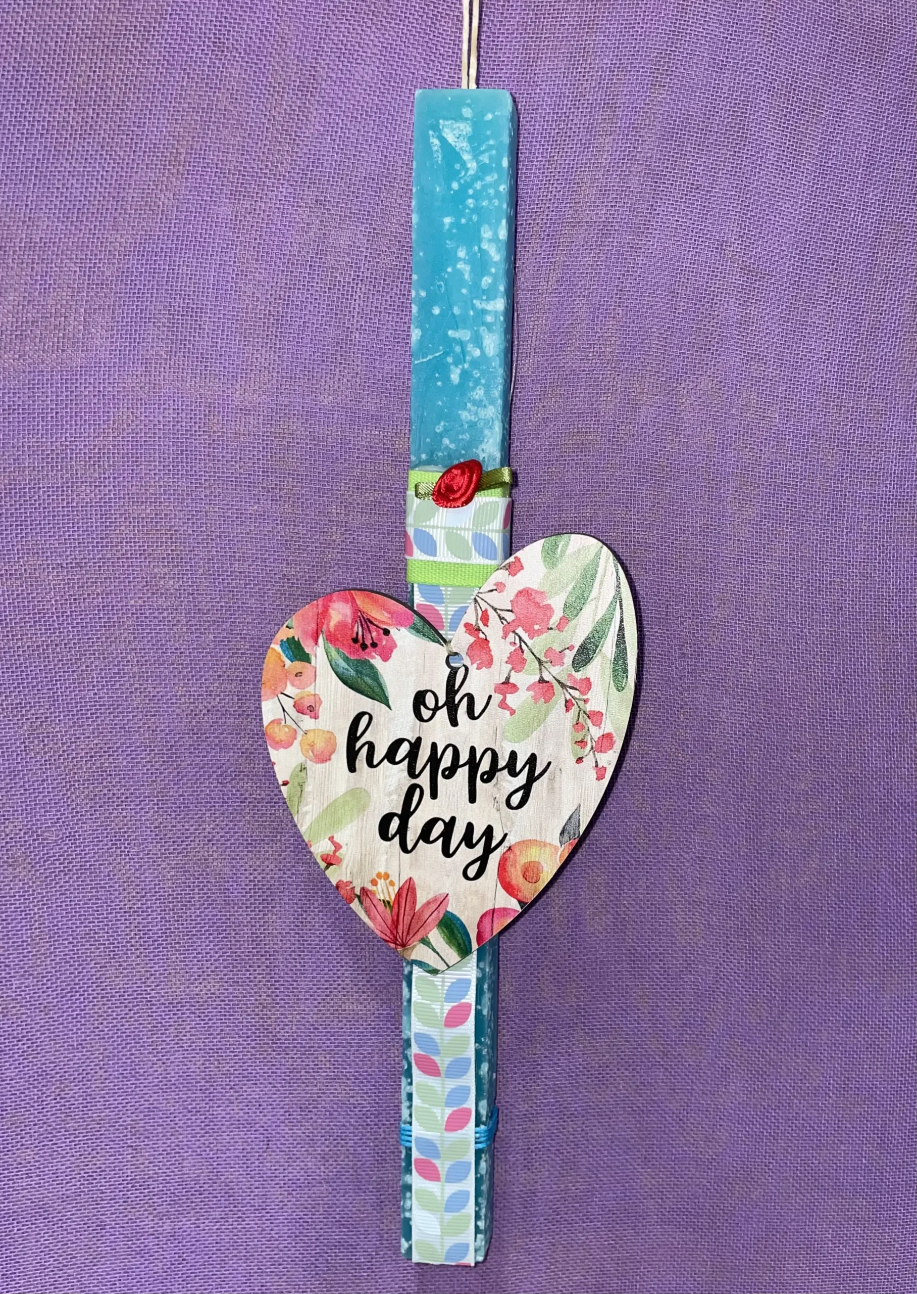 Τετράγωνη γαλάζια λαμπάδα με ξύλινη καρδιά ”Oh happy day”