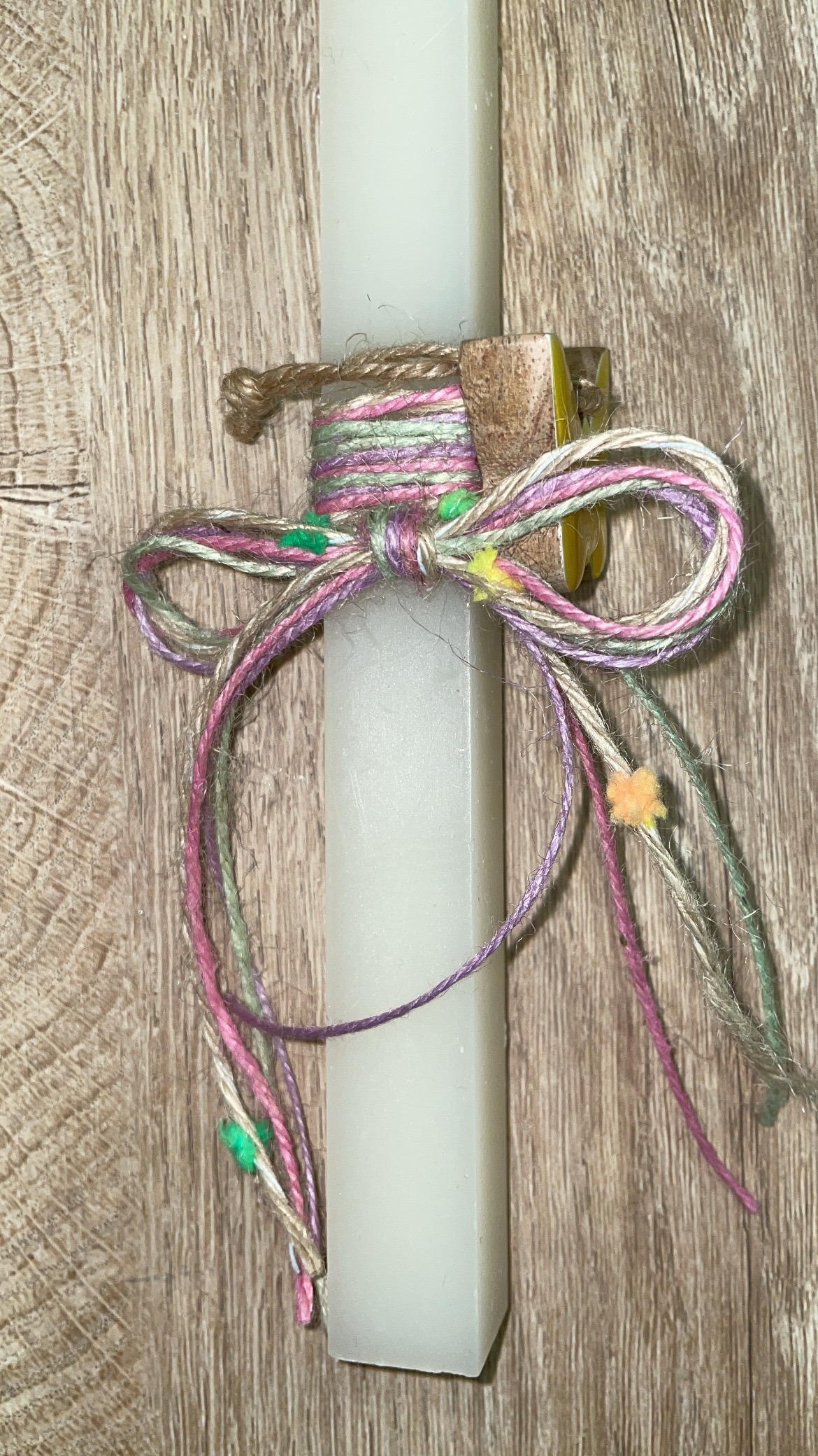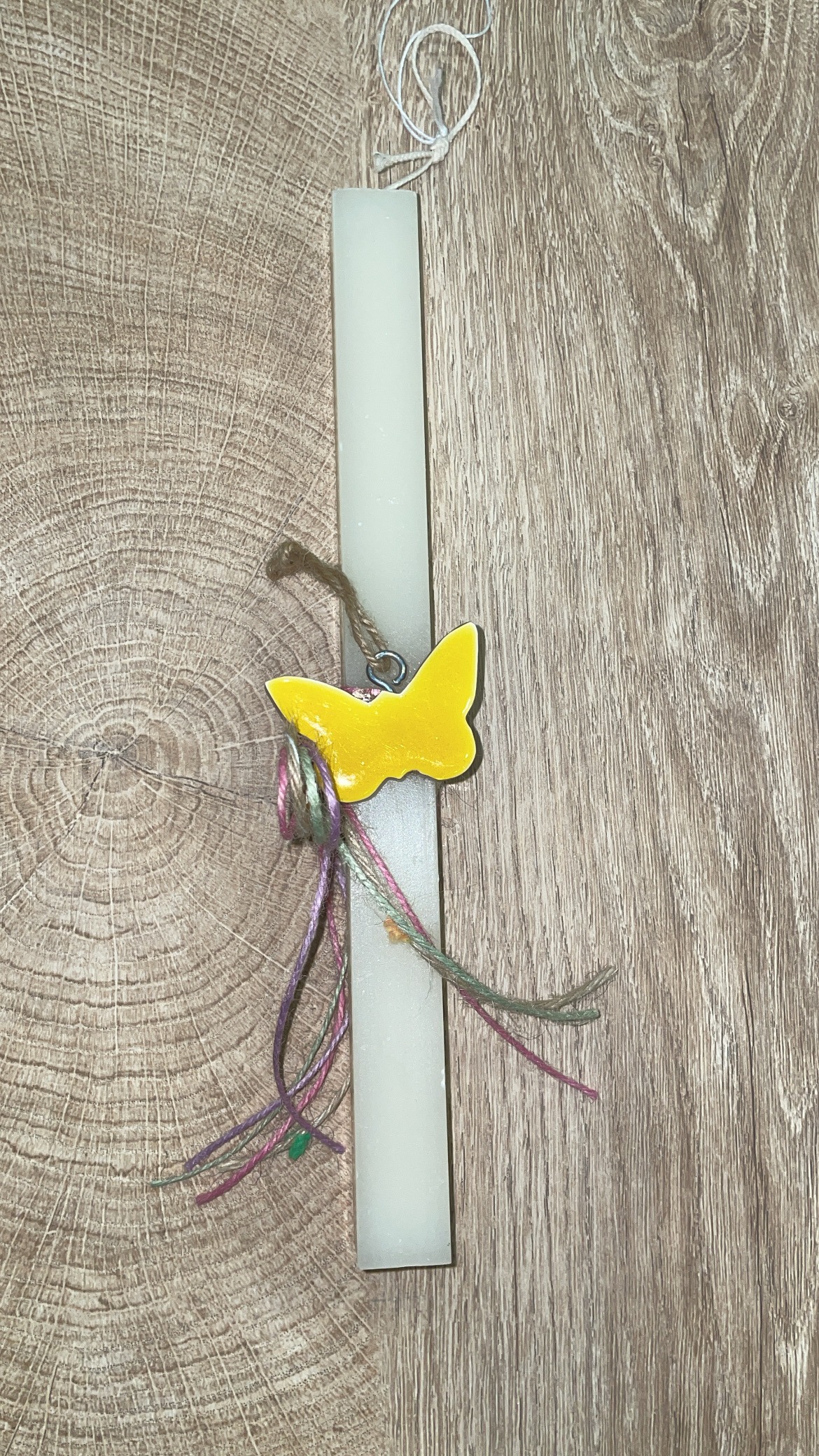 Tag: Τετράγωνη λευκή λαμπάδα με ξύλινη κίτρινη πεταλούδα
