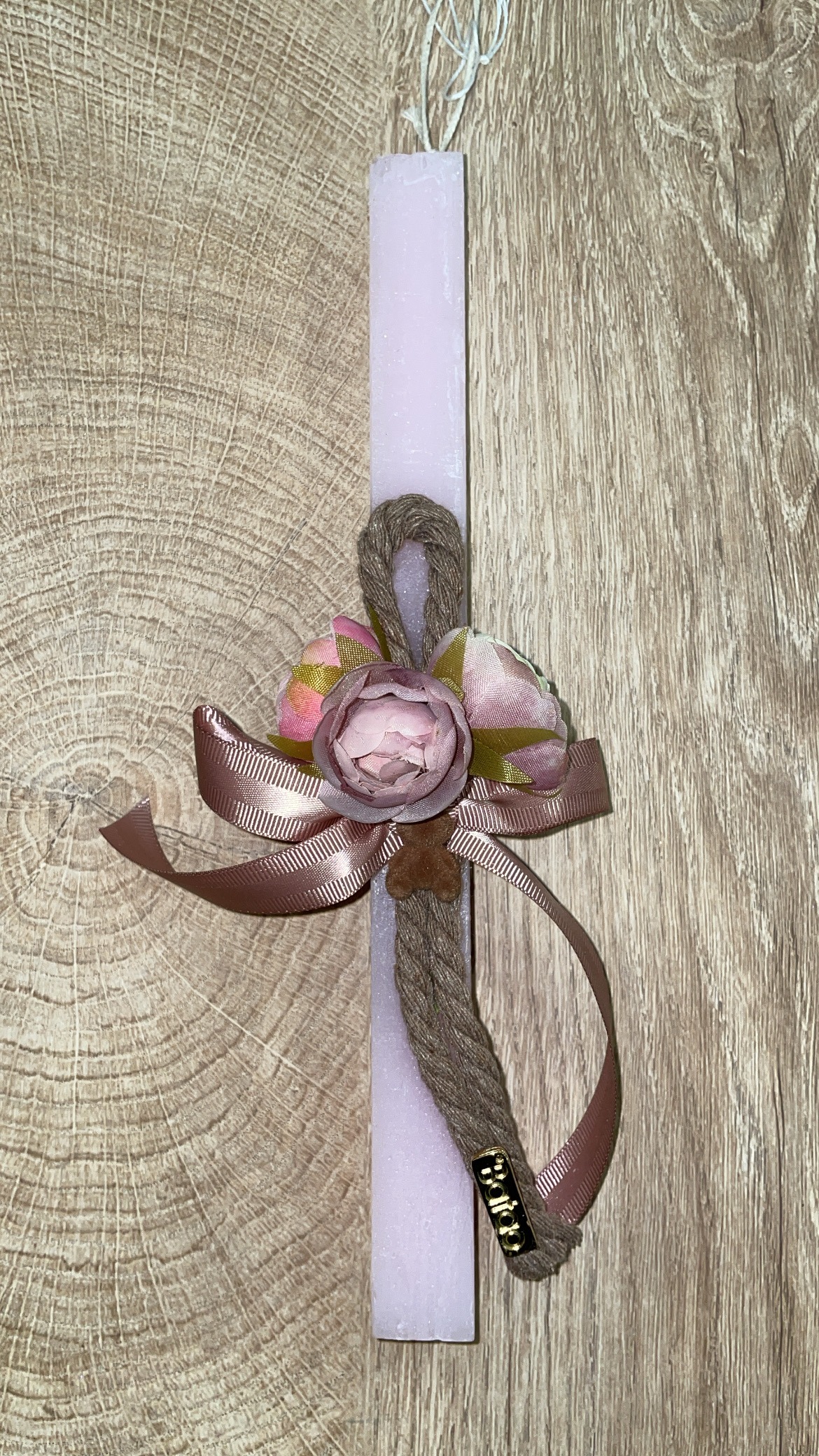 Τετράγωνη ροζ λαμπάδα με μπουκέτο υφασμάτινα λουλούδια
