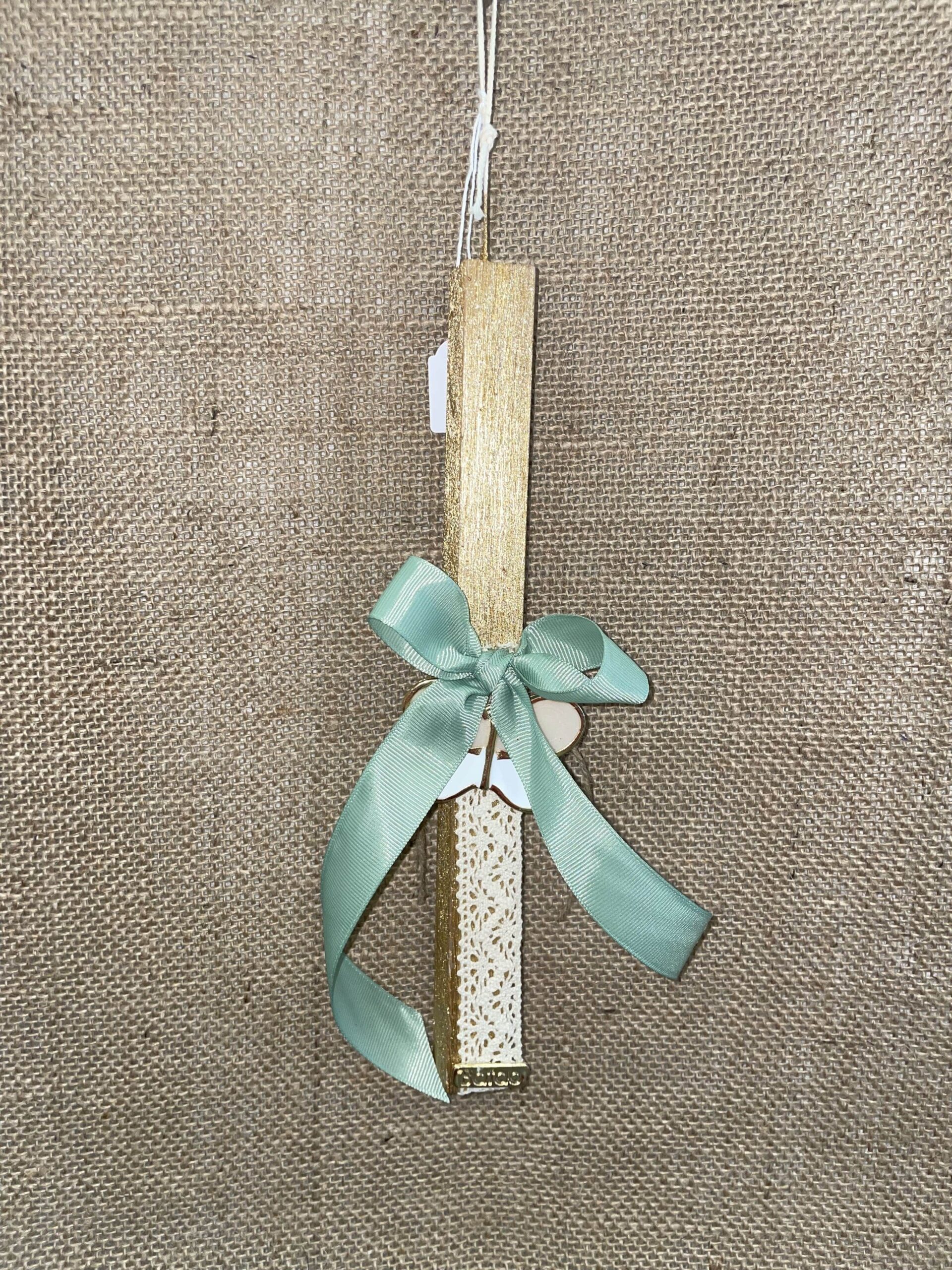 Χρυσή τετράγωνη λαμπάδα με πεταλούδα μεταλλική κρεμαστή και μέντα φιόγκο